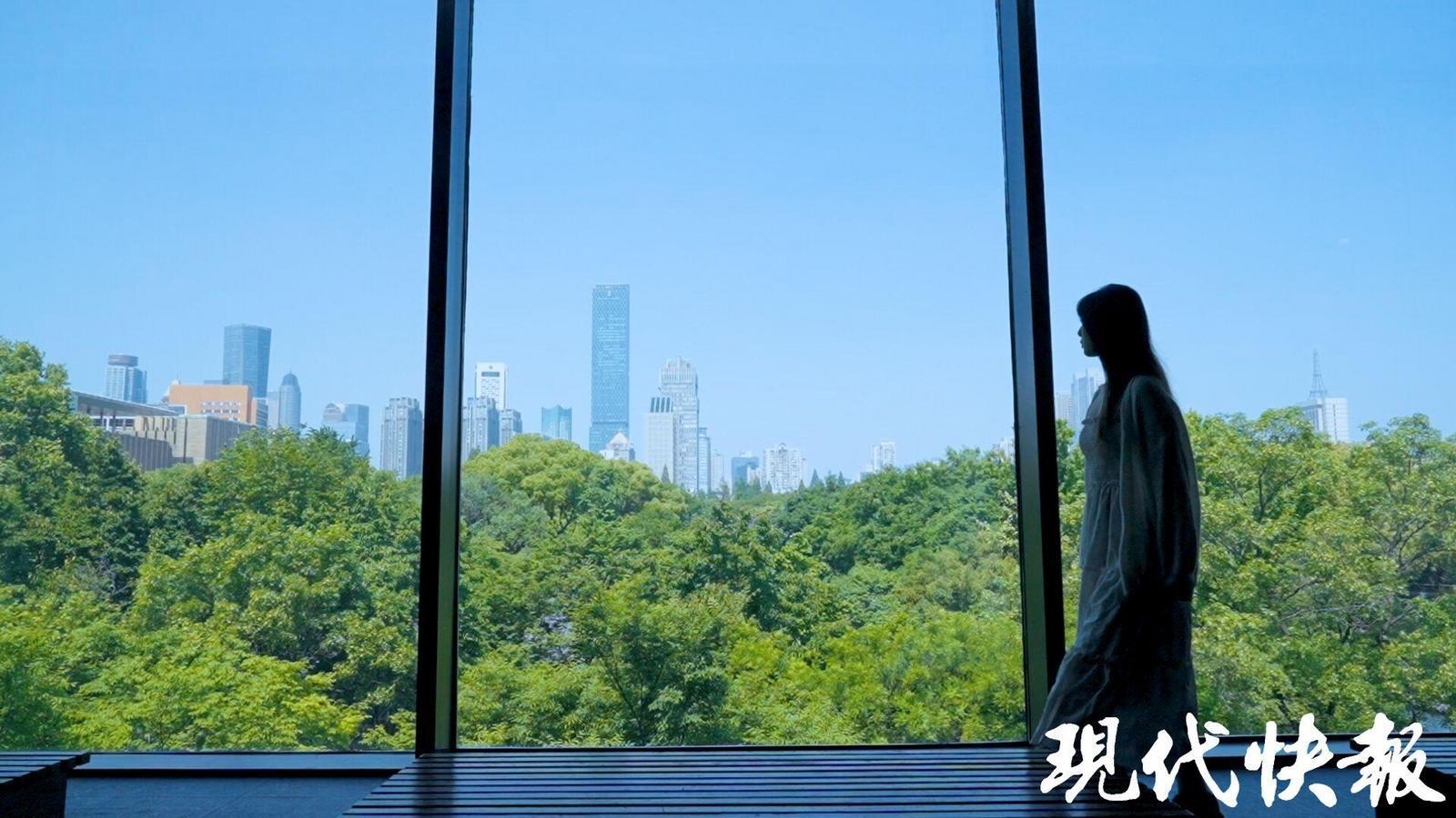 晨光弹指而过,窗外郁郁葱葱,远处是新街口城市天际线,季节与历史交叠同框。