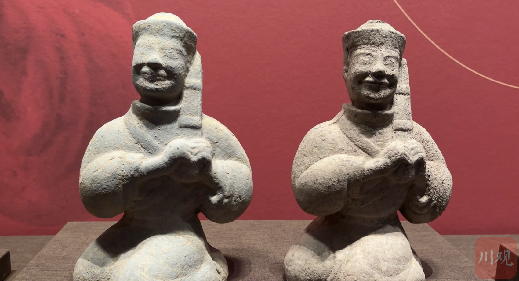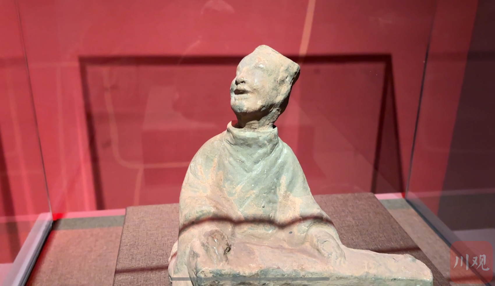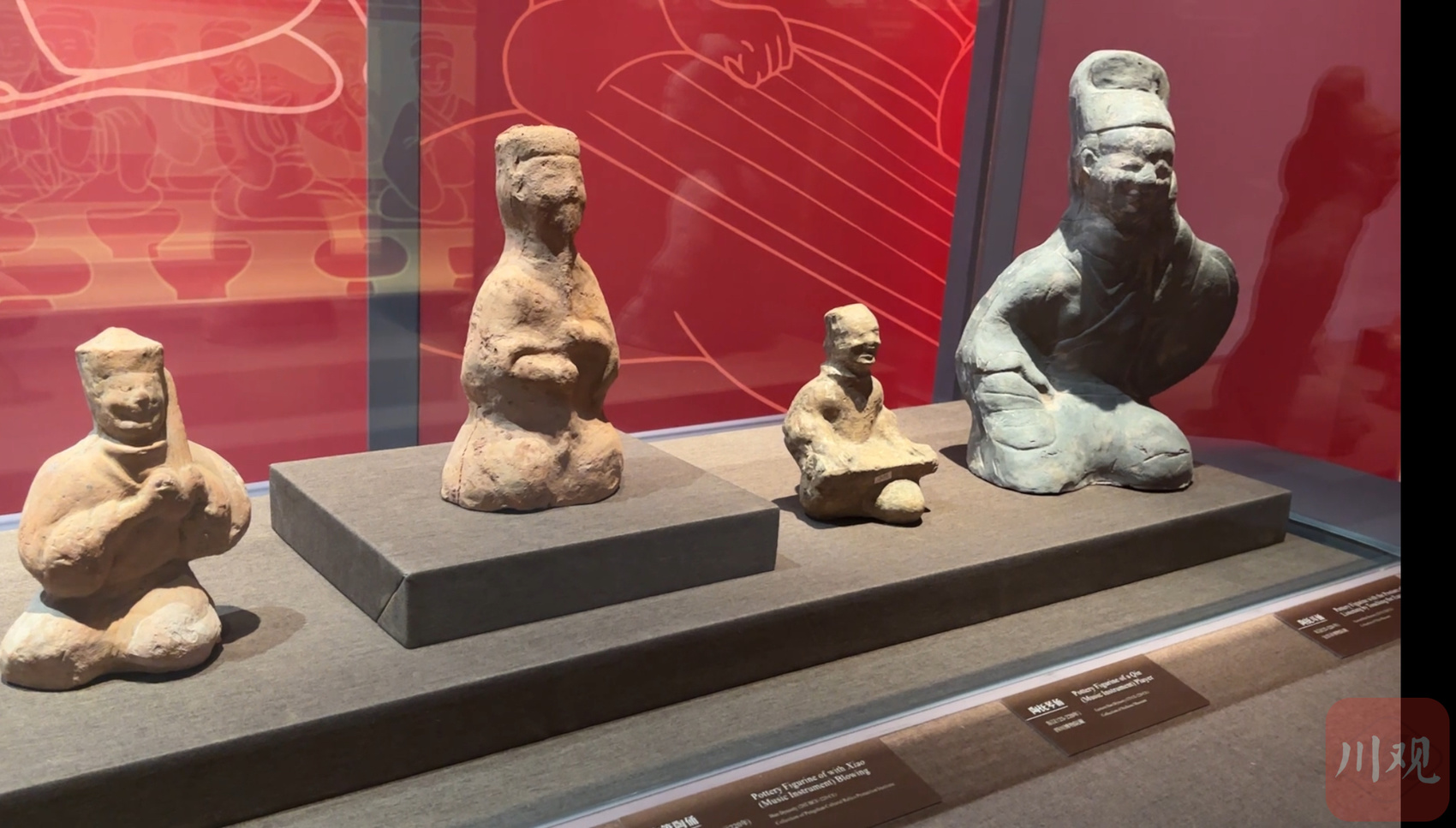 展览中,还可以看到大量姿态各异、造型优美的两汉三国时期的乐舞百戏俑以及画像砖等,再现了古代巴蜀人民乐天开朗的精神状态。展品中,1957年出土于成都天回山东汉崖墓的击鼓说唱俑十分亮眼,它头戴小帽,袒胸露腹,着裤赤足,左手抱鼓,右手敲击,张口嘻笑,动作夸张,和保存于国家博物馆的“汉代第一俑”说唱俑异曲同工。而一件胡人吹箫俑则反映出伴随着古代丝绸之路的开放,西域乐师也来到了巴蜀地区,古代巴蜀的开放可见一斑。