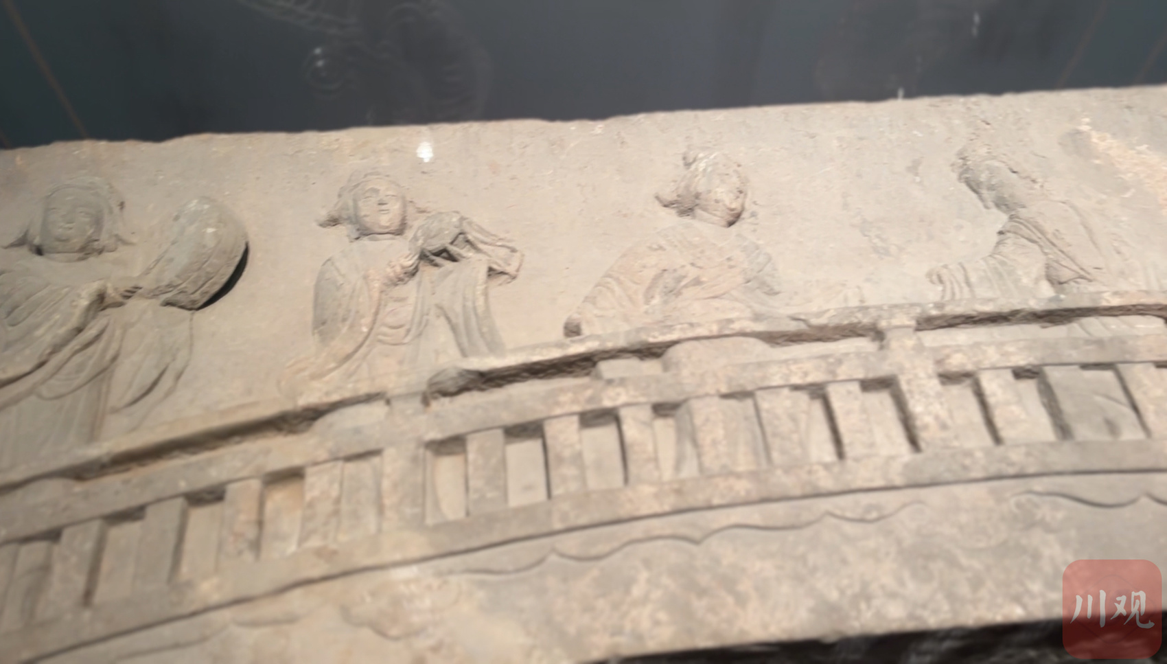有意思的是,展览还让观众见识了宋代时期的“勾栏”长什么样——出土于泸县的勾栏乐舞石刻,弧形的勾栏上雕刻了6位正在进行表演的乐舞女伎。她们头戴花冠、穿着长裙、衣袖宽大,肩披流苏云肩。两人起舞四人伴奏,再现了宋代民间乐舞的流行与兴盛。