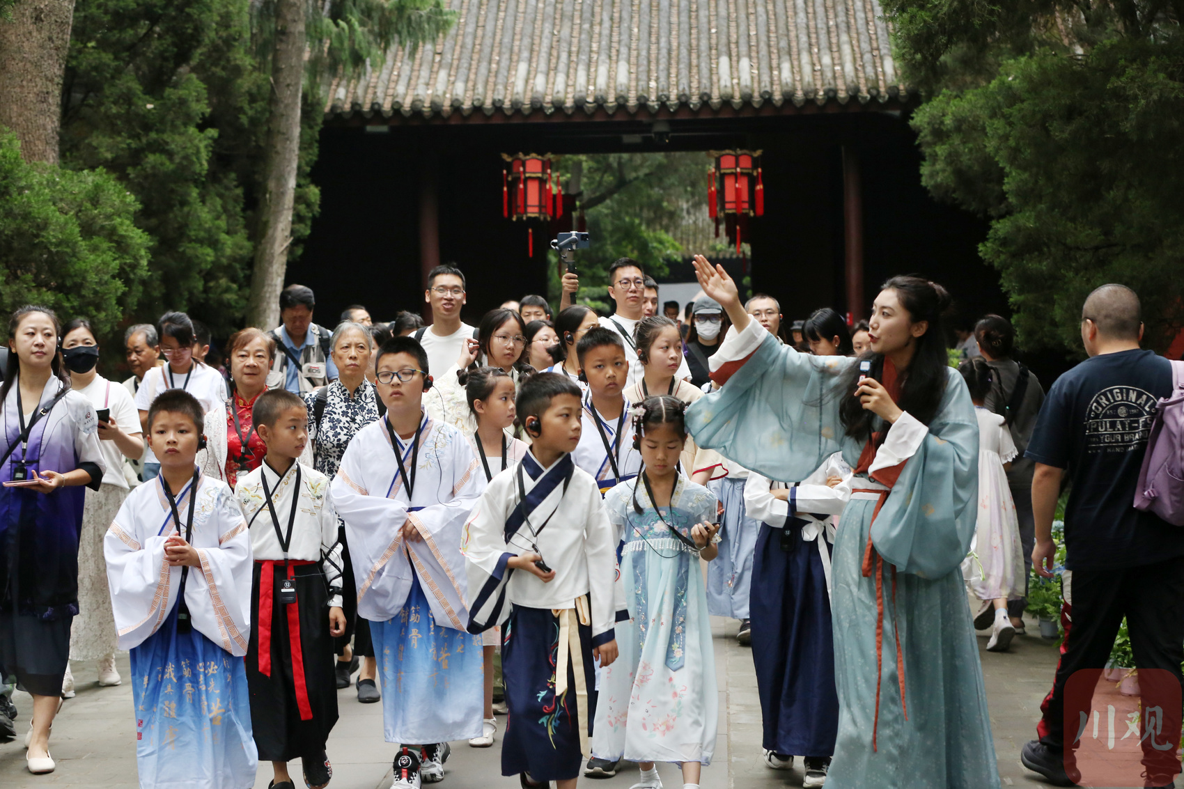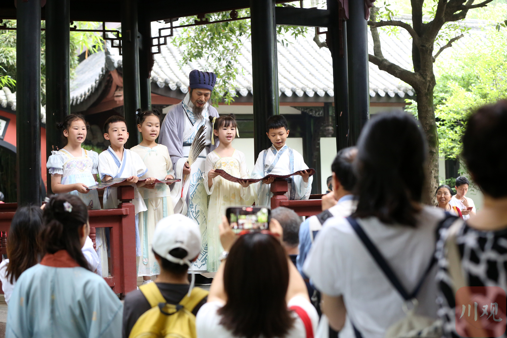 当日,武侯祠博物馆面向公众免费开放,博物馆内人流如织。众多市民观众走进博物馆,体验精彩的文化生活,汲取精神力量。“夫君子之行,静以修身,俭以养德... ...”武侯祠博物馆文物区琴亭前,“丞相智慧 千年传承——《诫子书》诵读活动”正如火如荼进行。“诸葛亮”手摇羽扇,凝神注目,身着汉服的小朋友手拿竹简,声音洪亮地吟诵着《诫子书》,吸引无数观众围观。更有不少观众跃跃欲试,纷纷加入活动,挑战现场背诵《诫子书》。