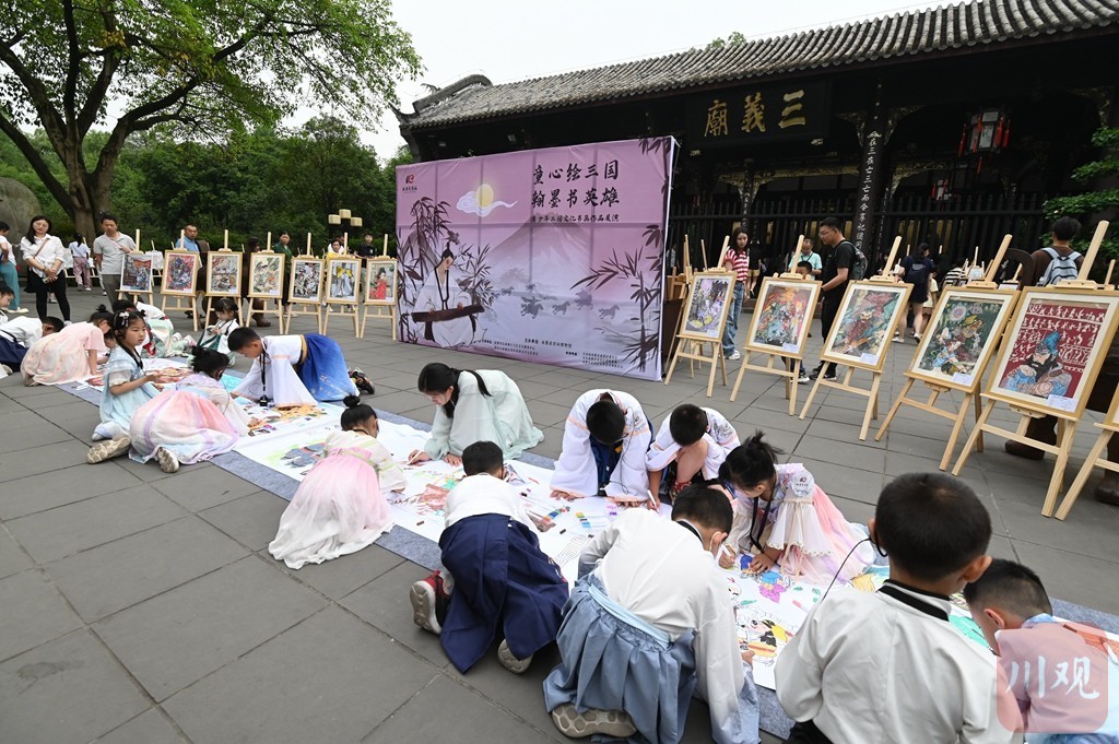 在武侯祠博物馆三义庙广场上,青少年现场绘制书画长卷,吸引众多市民观众或驻足观赏,或加入其中,场面蔚为壮观。据悉,此次活动展出了200余幅成都各中小学学生创作的三国文化主题书法、绘画作品。青少年用文字与图画生动演绎出三国文化的独特魅力。学习绘画近5年的徐同学专心致志地用画笔勾勒着,画作中一只憨态可掬的大熊猫正和诸葛亮坐在武侯祠红墙夹道里吃着火锅,作品颇具创意。徐同学曾是武侯祠的小小讲解员,对三国文化十分热爱,他说想借助画笔表达出这份热爱,向观众展示出成都所独有的亮丽风景。