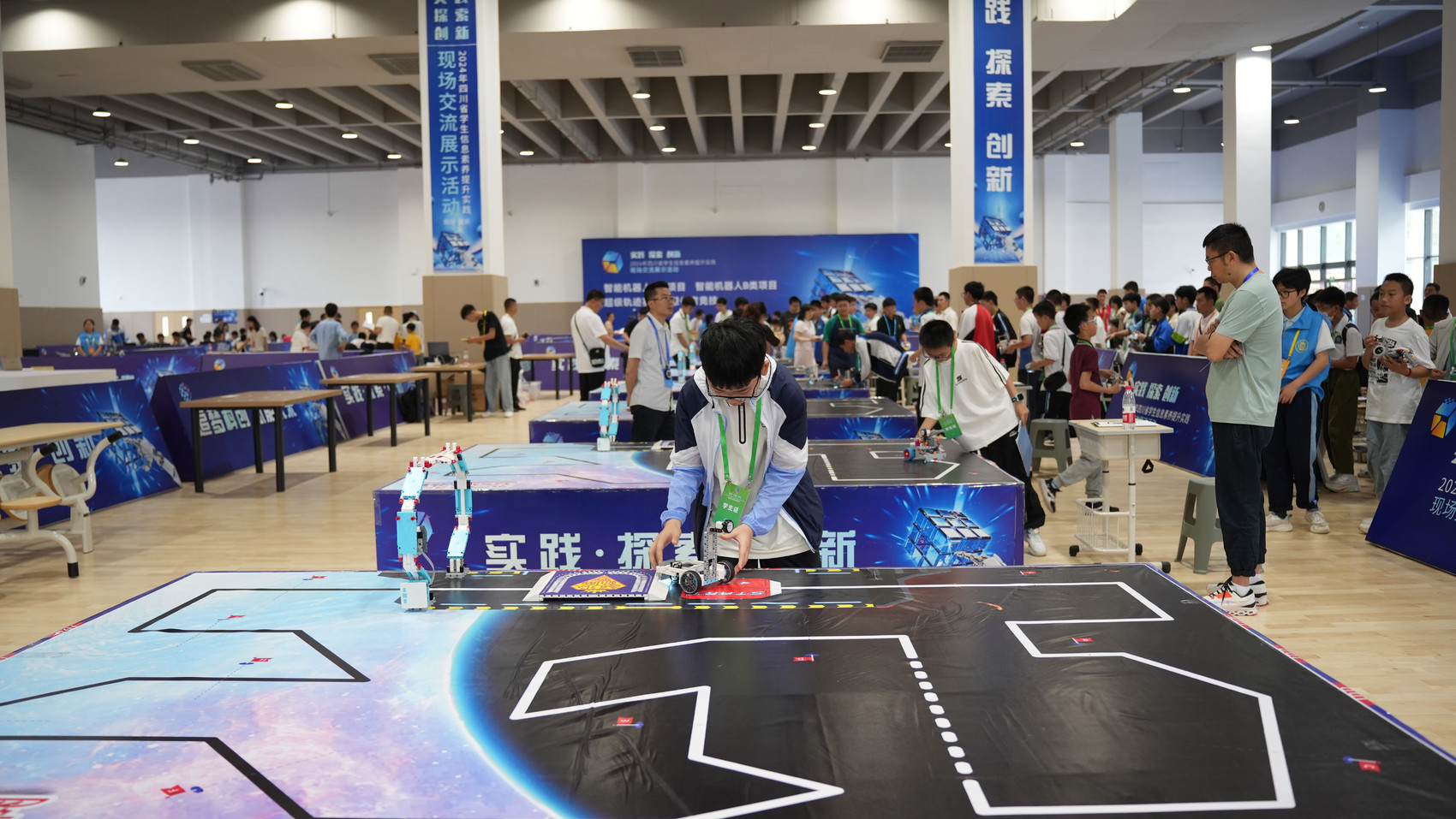 在超级轨道赛区域,学生们全神贯注,有条不紊地调试和操作机器。广元市旺苍县实验小学何坤鹏同学正专注地看着自己设计和编程的机器人,自动识别轨道线路并沿线前进,依次经过陡峭的斜坡、急转弯等复杂路径。“通过几周的备赛学习,我学会了组装机器人,编写程序,还可以在比赛场上随机应变地修改机器人。”何坤鹏笑着说,从小就喜欢机器人,通过比赛帮他打开了知识面,爱上了信息技术,爱上了科创,对未来他有自己的规划。“想当一名工程师。”