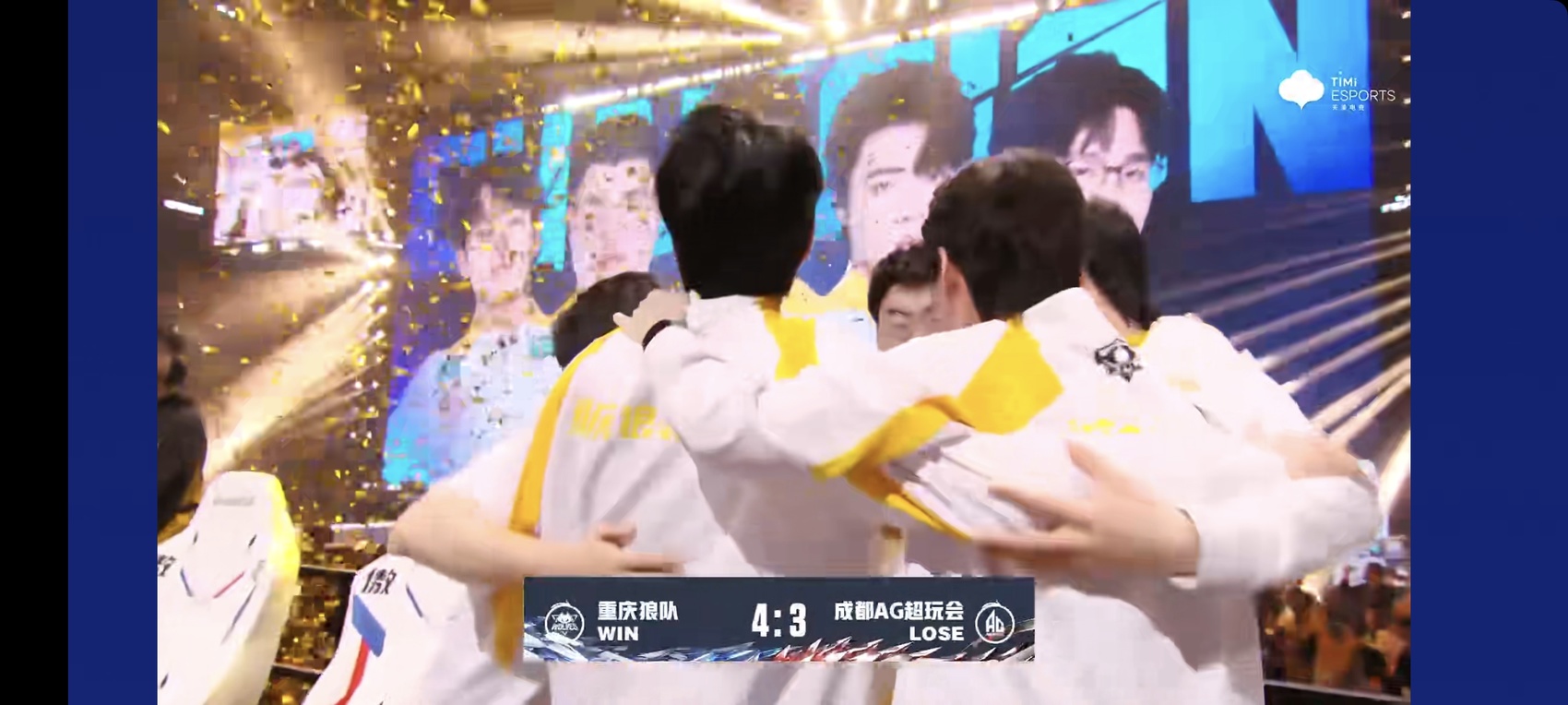 双方站在同一起跑线后,重庆狼队在第五局前期不占优的情况下逆风翻盘,率先拿到赛点。成都AG超玩会在第六局再度反扑,将大比分扳成3:3平。最后一局,成都AG超玩会没有顶住对方的持续进攻输出,遗憾败北。重庆狼队也成为全联盟首支“10冠”战队。