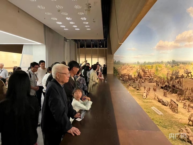 游客在郑州商代都城遗址博物院观看筑城场景复原(央广网发 马玉鹏 摄)