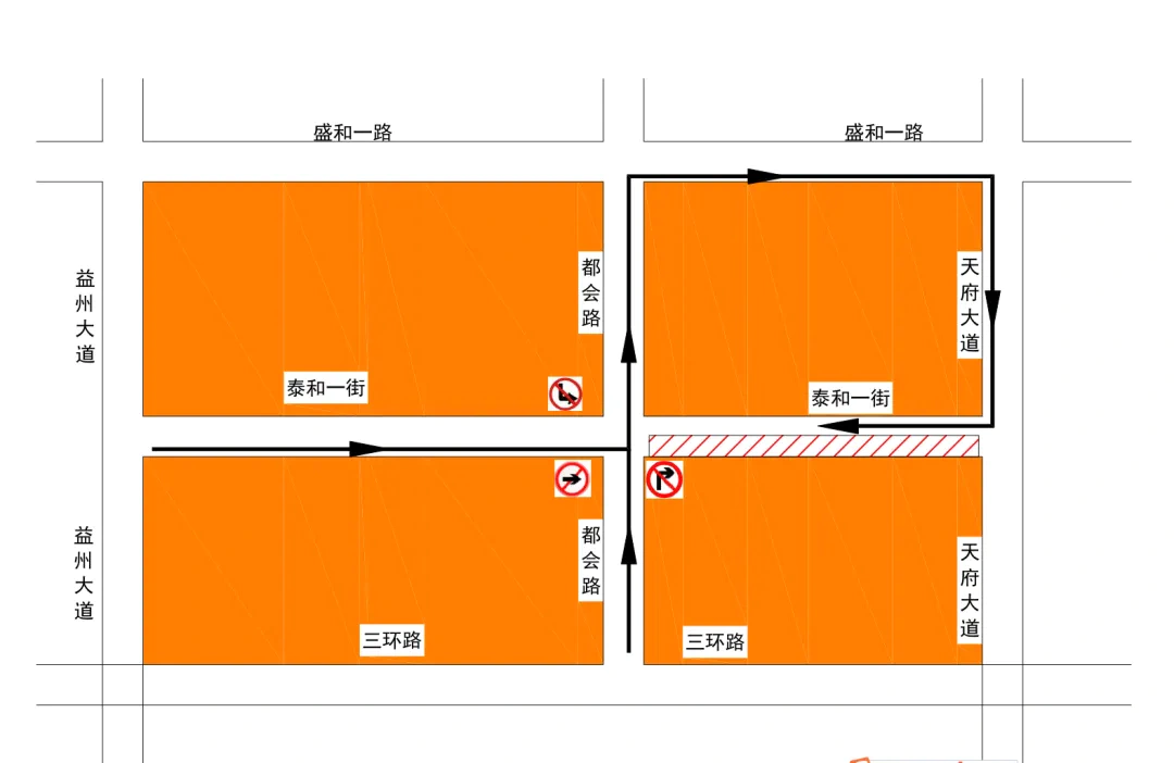 一、2024年5月23日至2024年7月23日(工期2个月),高新区泰和一街(都会路至天府大道)实施机动车由东向西单向交通组织。行人、非机动车请按照交通标志提示谨慎通行。