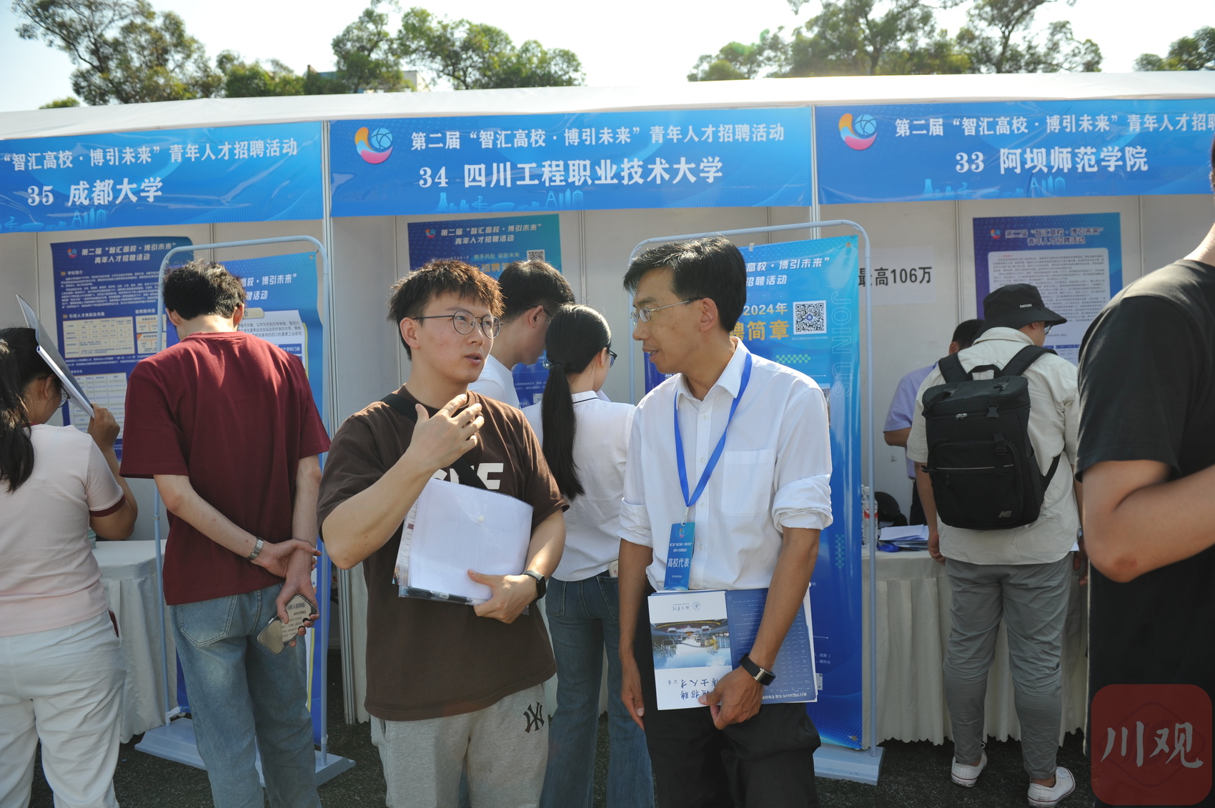 招聘展台前,四川农业大学人事处人才办主任尚永胜与前来应聘的博士毕业生交流。他告诉记者,四川农业大学高度重视这次招聘活动。“与去年相比,今年提供的岗位类别更多、数量更是翻了一倍。从‘团队首席科学家’到‘辅导员及管理岗位教师’,一共有6类岗位,且‘青年研究员’没有名额限制。”