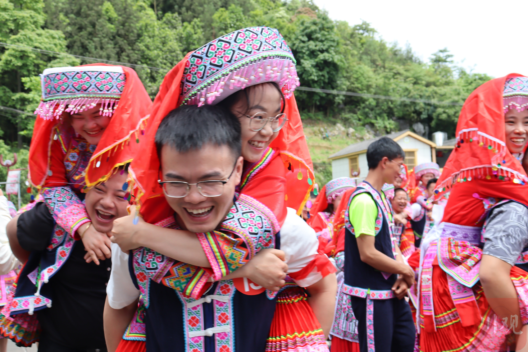 在现场,新人们拜天地、高堂、对拜,将婚礼活动推向了高潮,赢得了游客们的阵阵欢呼声,游客看热闹、看稀奇的同时也感受到了苗族婚礼的隆重和特别。郭艳特地从外地赶赴仙峰山,也被苗族婚礼的氛围感染,换上了一套苗装:“如果时光倒退20年,我也会带着我的“咪多”一起来参加。”