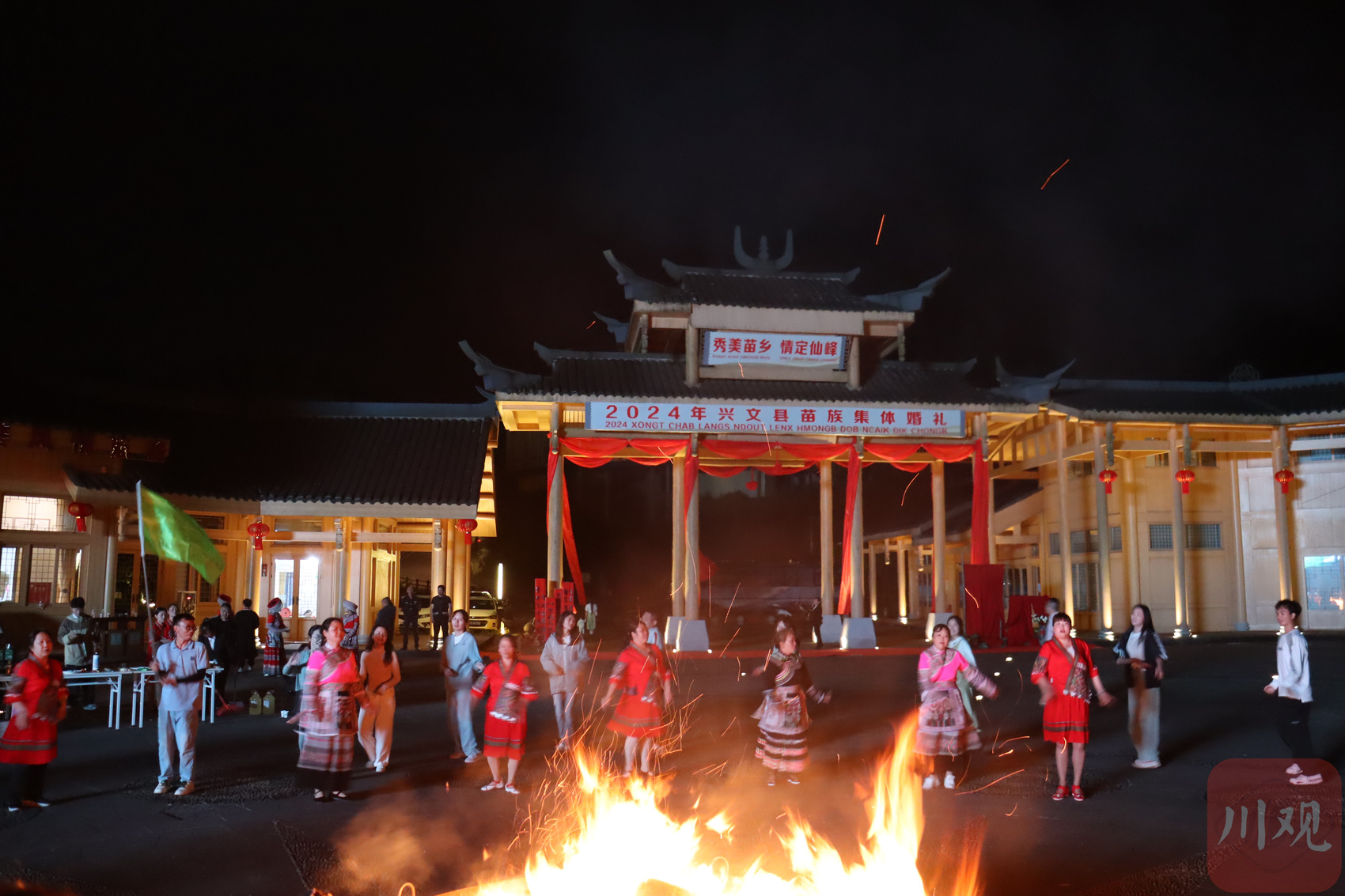 19日傍晚,仙峰镇的广场上燃起熊熊篝火,52对“咪多”“咪猜”团坐在篝火旁,一场篝火晚会即将开始。“咪多”“咪猜”是苗语中对小伙、姑娘的称呼。现场响起苗族的情歌对唱,众人畅饮苗乡米酒,围绕篝火起舞,现场气氛热烈欢快。