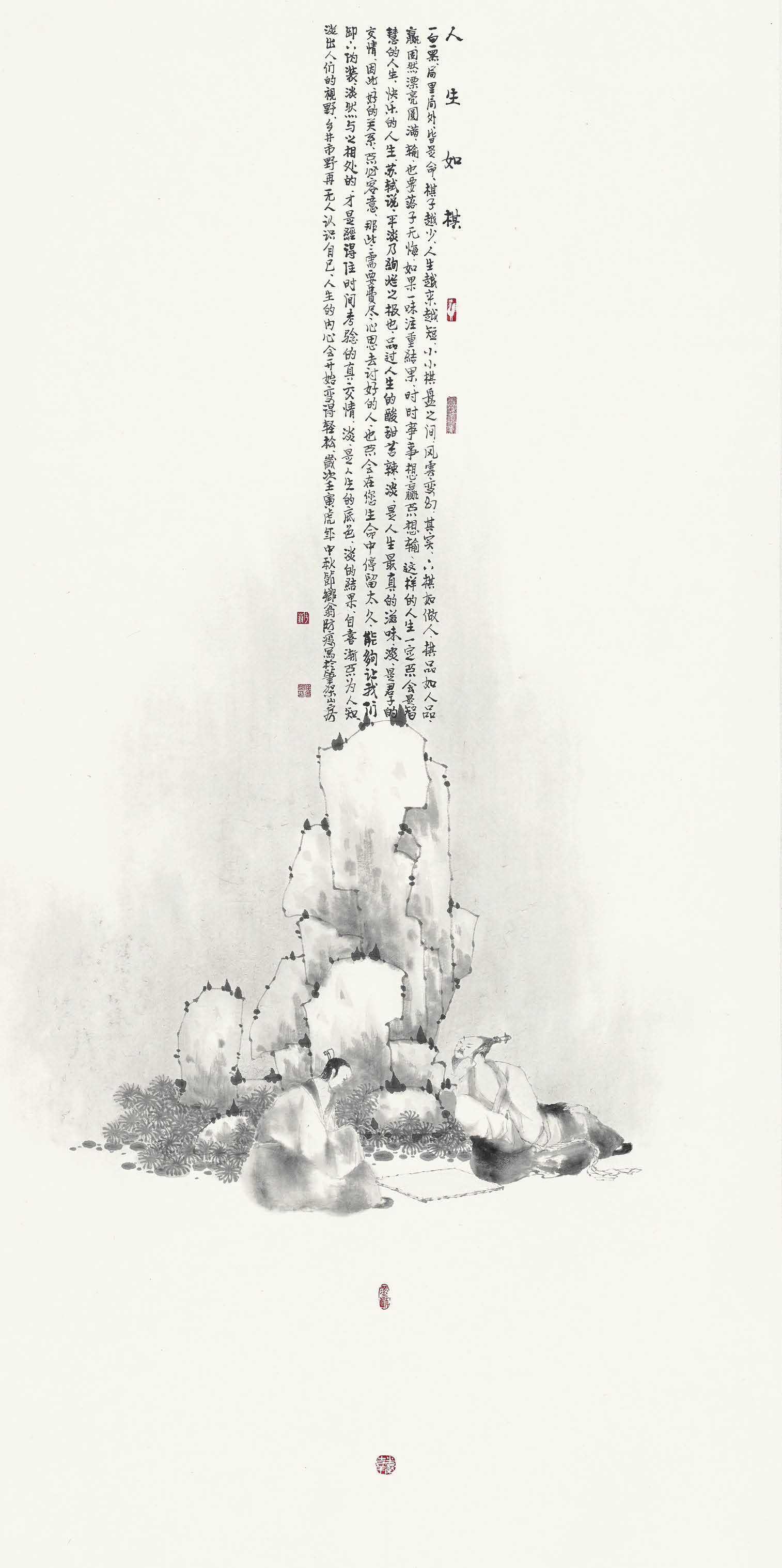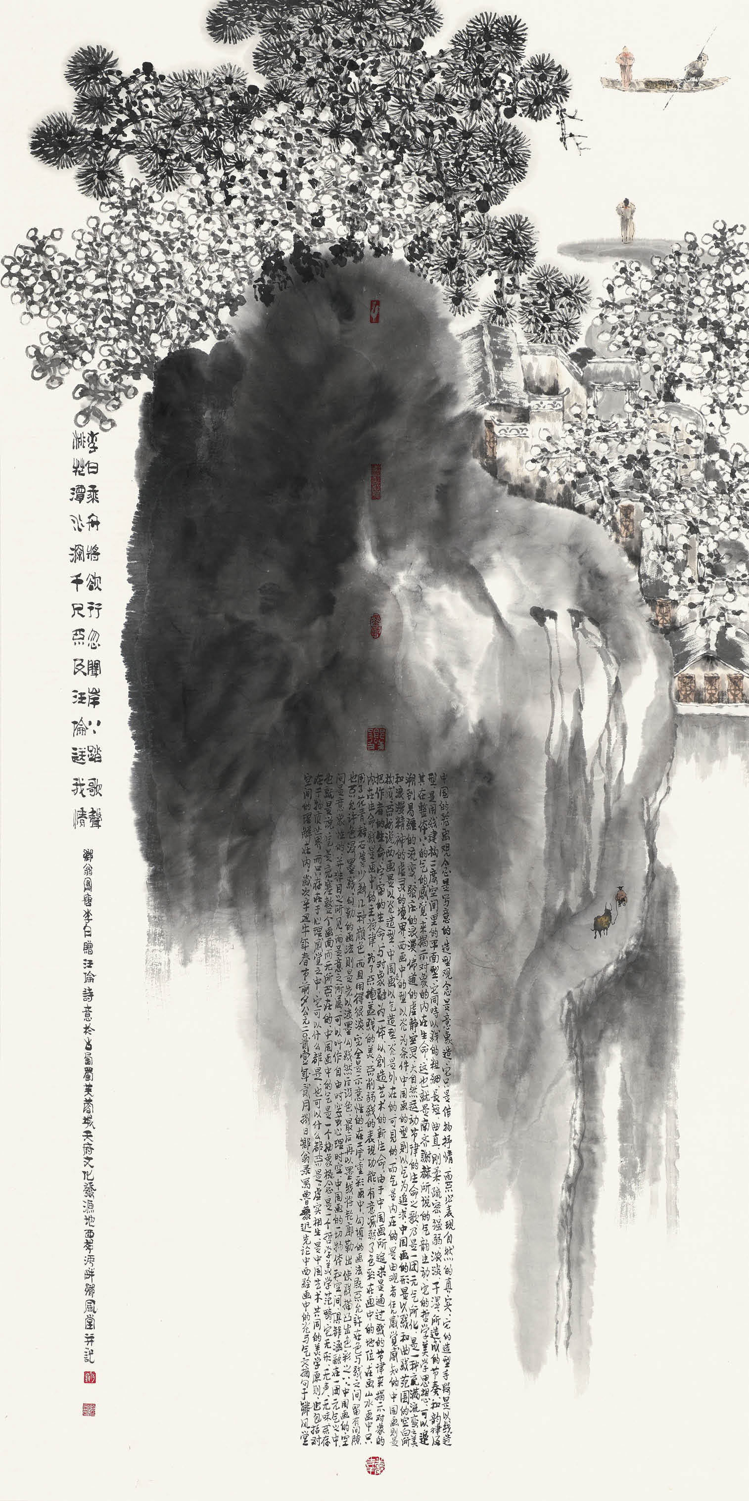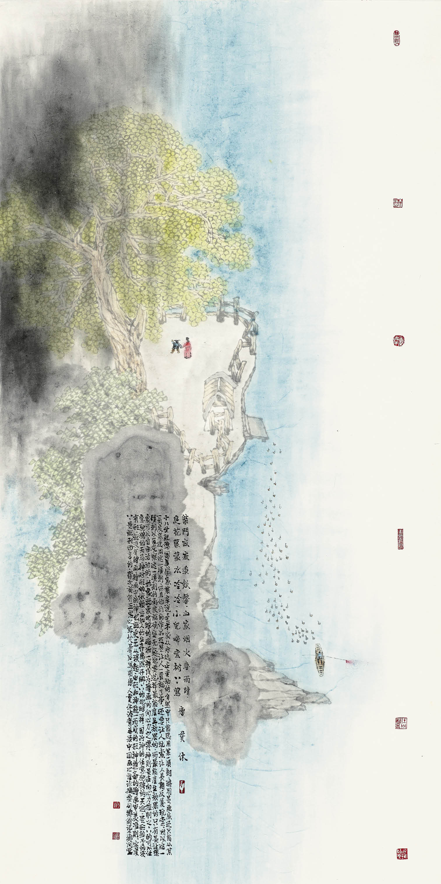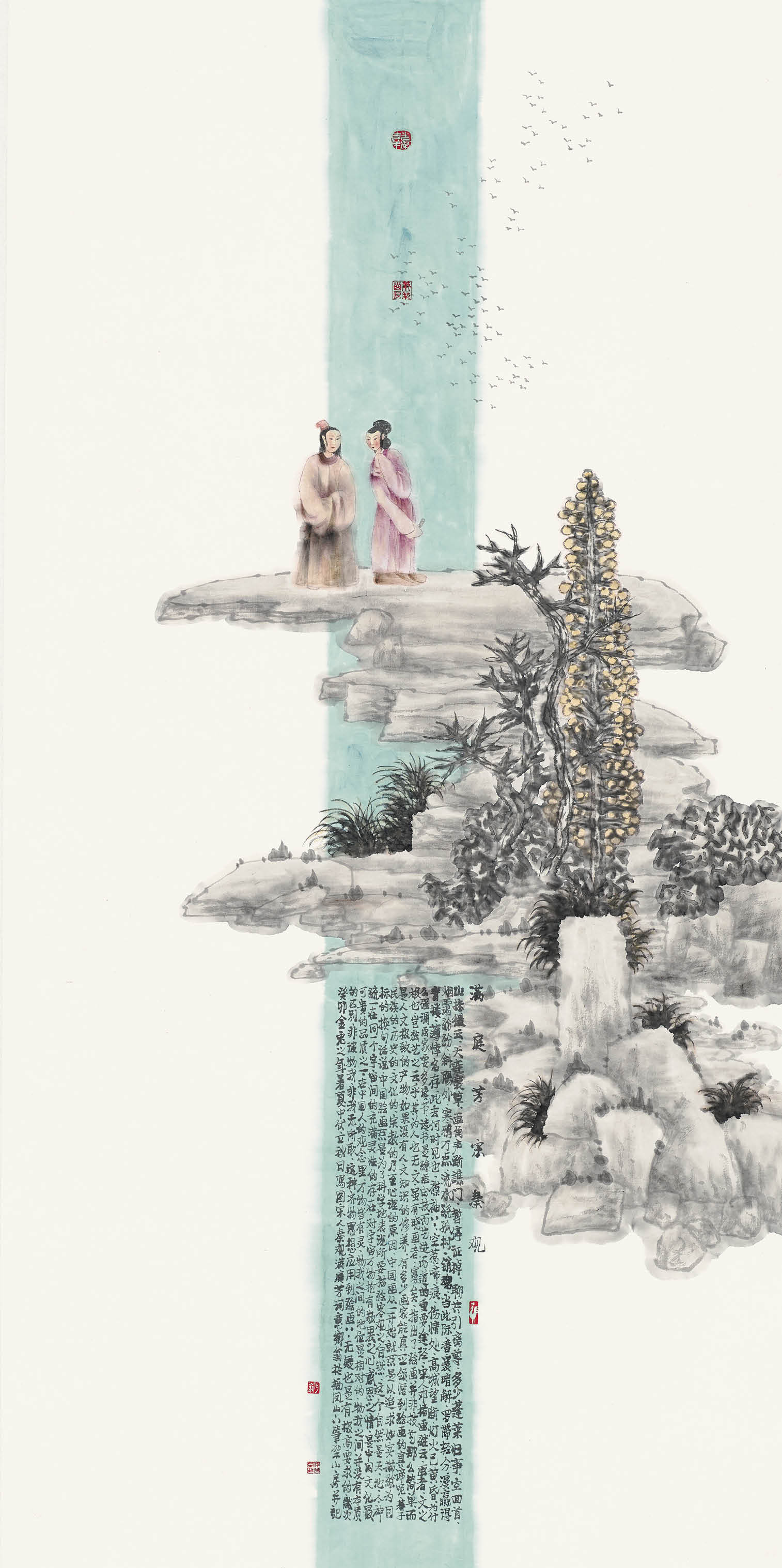 比如,他将传统的山水、人物、花鸟、诗词曲的背景、作者的身份、所处的时空场景等元素进行艺术分解,把诗词曲的意象具象化、物像写意化,将大到山川湖海、亭台楼榭、人物形象,小到衣纹布褶、昆虫花卉等不同对象进行曲折、连续、迂回的景别处理,常常给人“山重水复疑无路,柳暗花明又一村”审美刺激。尤其在表现场面宏大、情节复杂、人物众多、景物丰富的题材方面表现得更加突出,创造出一种新的绘画语境。