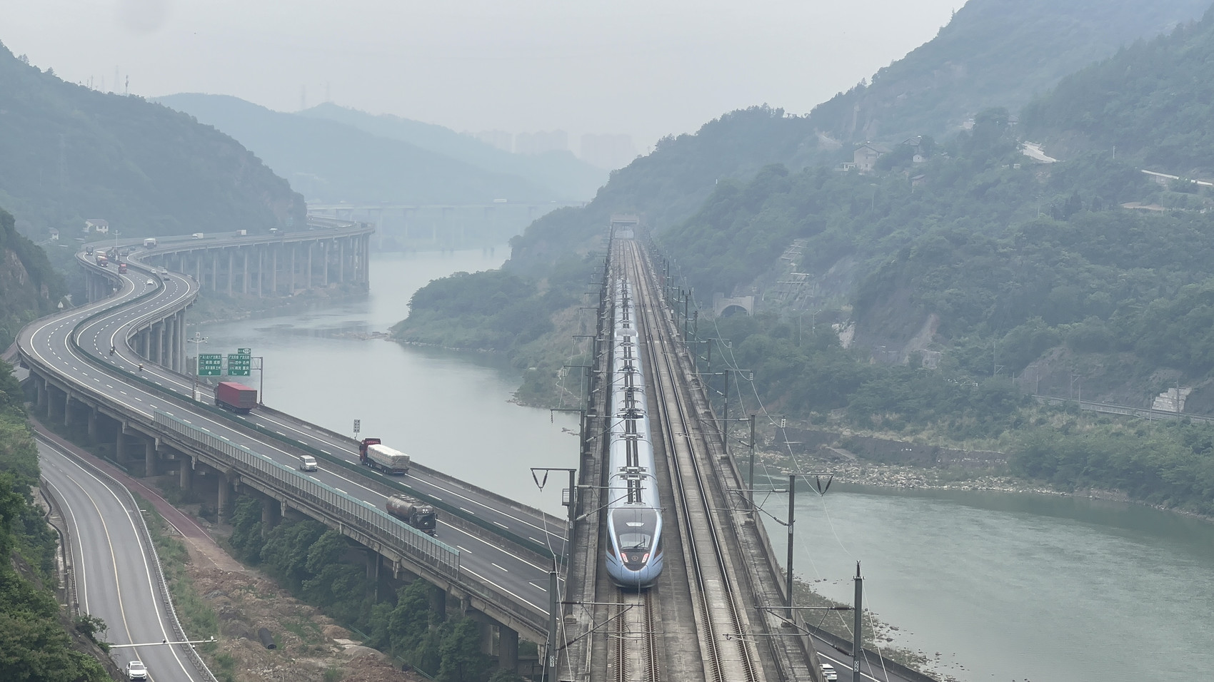 广元市嘉陵江大桥上,西成高铁、宝成铁路、川陕高速、京昆高速公路广陕段、兰渝铁路交叉而过。