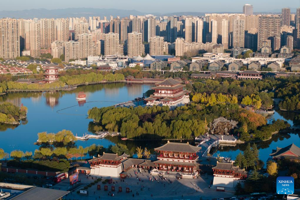 An aerial drone photo taken on Nov. 17, 2023 shows a view of the Tang Paradise, a complex based on the site of the original relic of an imperial garden dating back to the Tang Dynasty (618-907), in Xi'an, northwest China's Shaanxi Province. Xi'an, one of the ancient capitals in Chinese history, attracts a growing number of tourists in recent years. (Xinhua/Shao Rui)