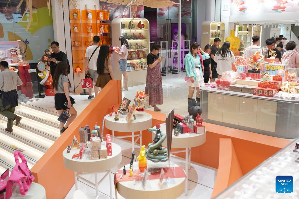 Tourists select cultural and creation products at a shop in the Great Tang All Day Mall in Xi'an, capital of northwest China's Shaanxi Province, May 20, 2024. Xi'an, one of the ancient capitals in Chinese history, attracts a growing number of tourists in recent years. (Xinhua/Shao Rui)