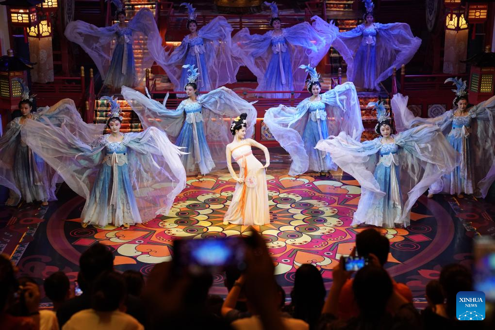 Tourists watch a performance at a theme block in Xi'an, northwest China's Shaanxi Province, May 19, 2024. Xi'an, one of the ancient capitals in Chinese history, attracts a growing number of tourists in recent years. (Xinhua/Shao Rui)