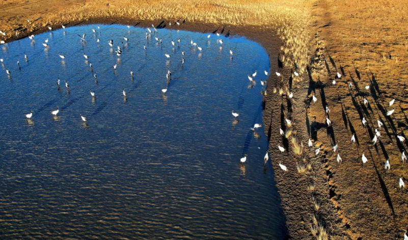 国家一级保护动物黑颈鹤在红原县月亮湾湿地过冬 摄影/C视觉 李向雨