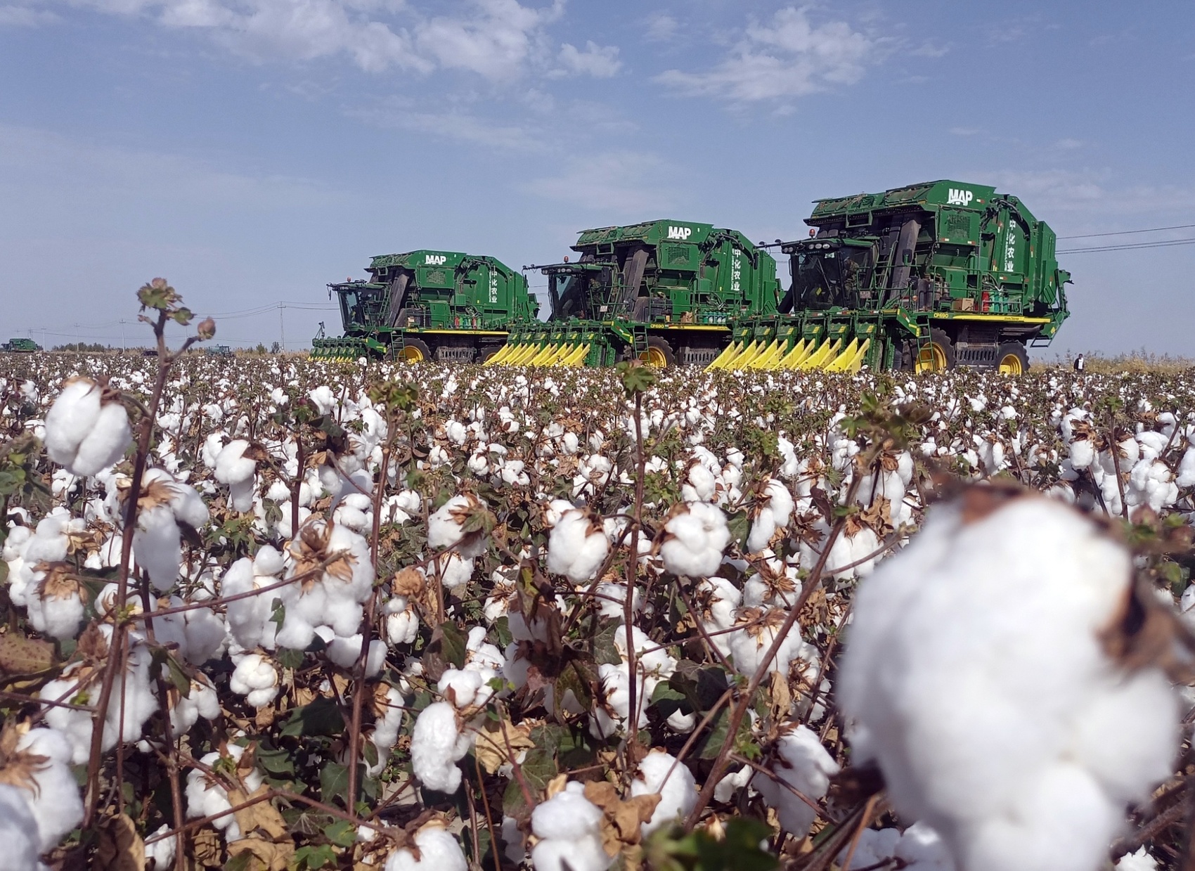 新疆塔城,采棉机采收沙湾市老沙湾镇老沙湾新村向阳农业专业合作社的棉花。