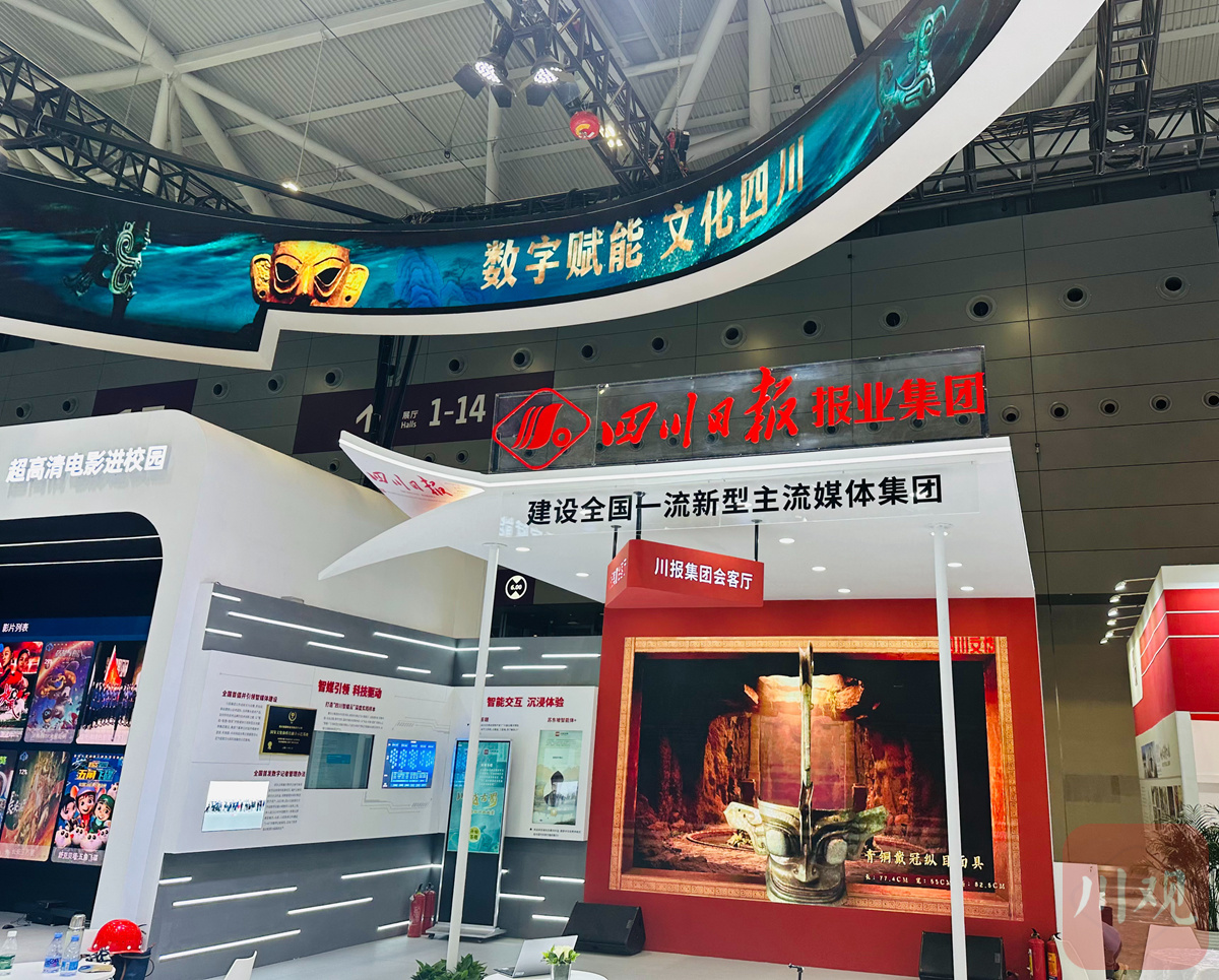 在展馆另一侧的四川日报报业集团展台,四川报业博物馆图景映入眼帘,同时以川观数字记者等一系列智媒科技应用,让巴蜀文化“活”起来。在中央区域LED大屏,还循环播放“三星堆——沉睡数千年,一醒惊天下”平面裸眼3D视频,把三星堆17件精选文物串联成一场跨越时空的文明之旅。