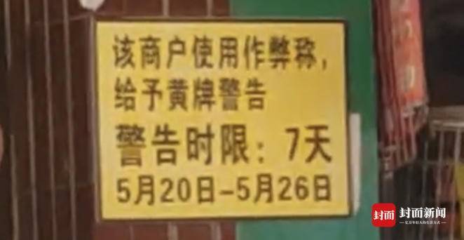 “该商户使用作弊秤,给予黄牌警告,警告时限:7天,5月20日—5月26日”。