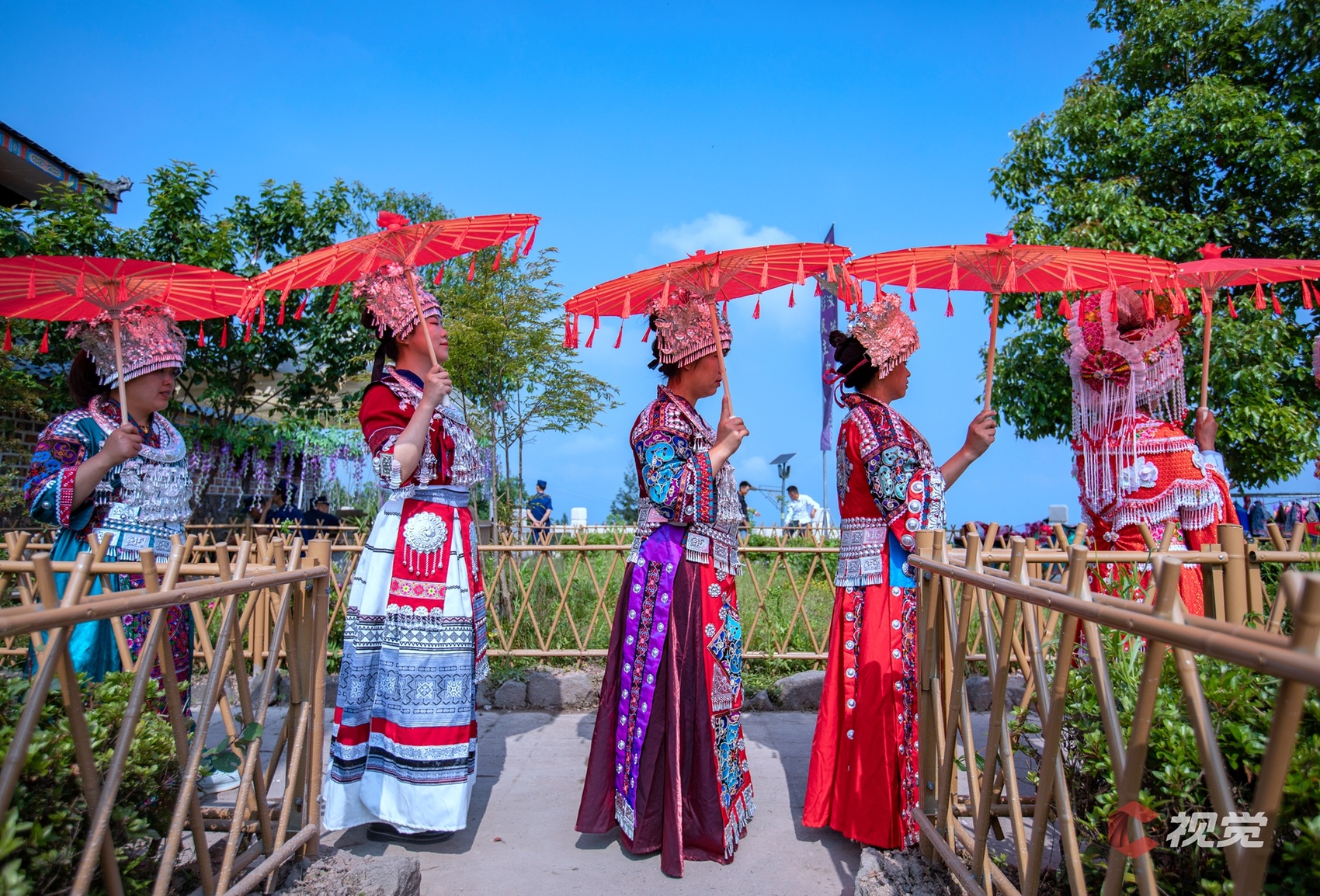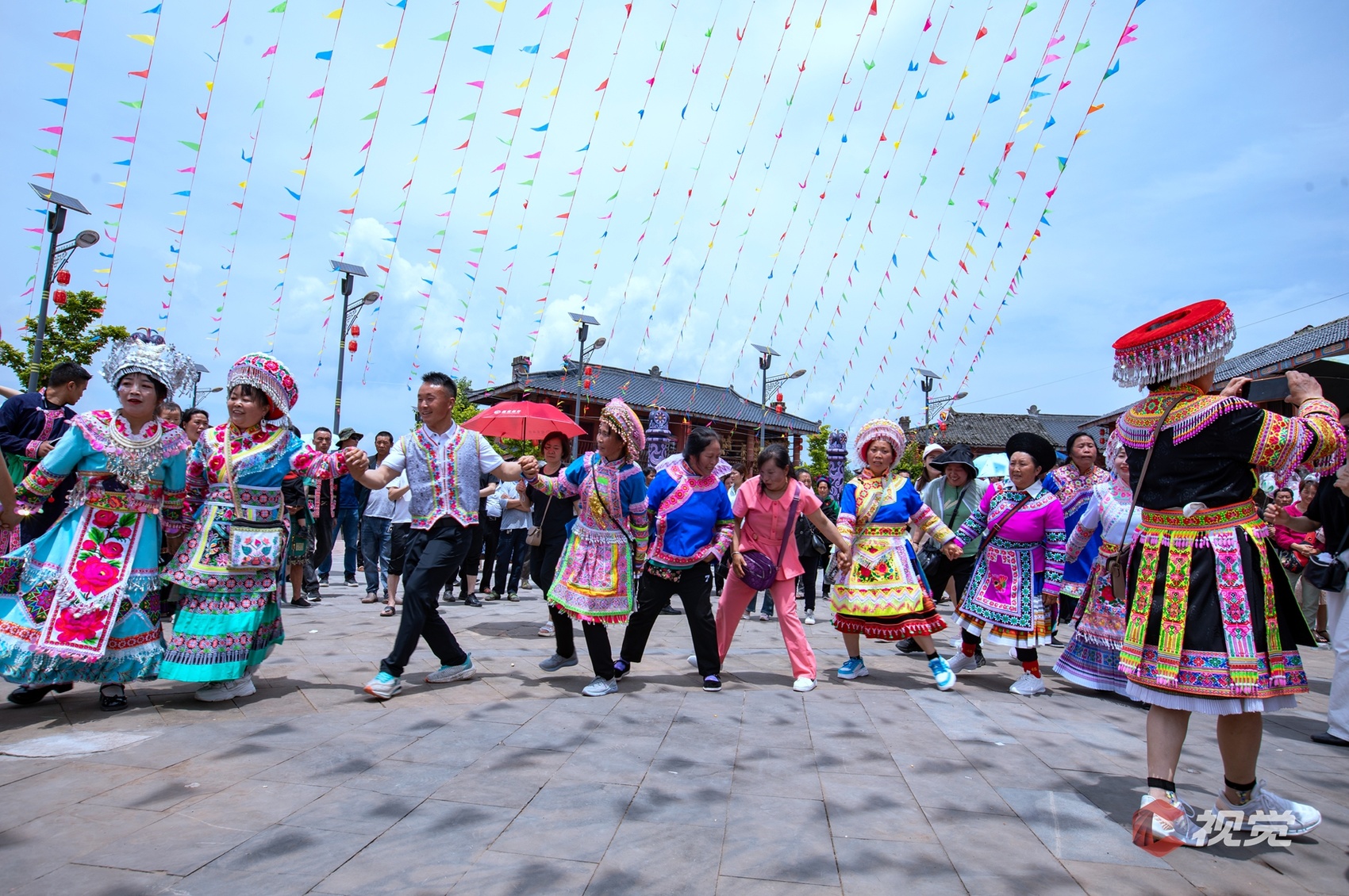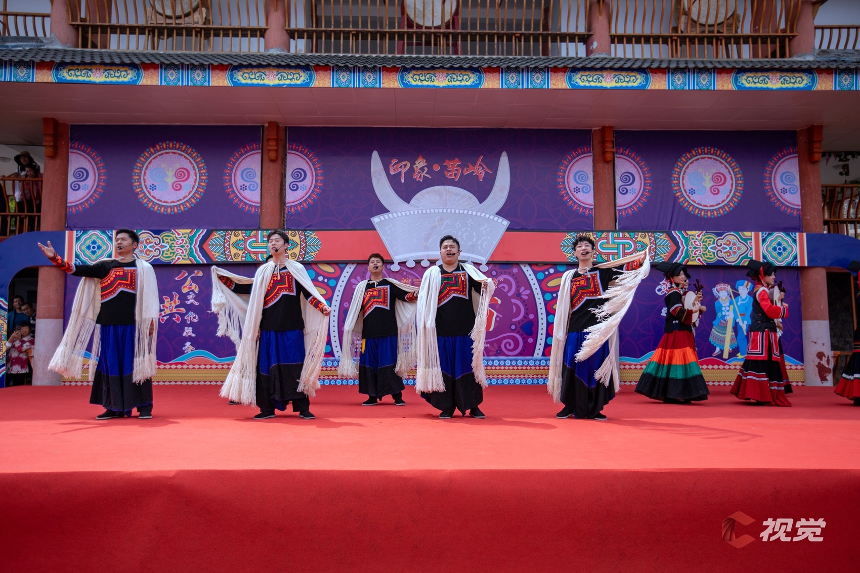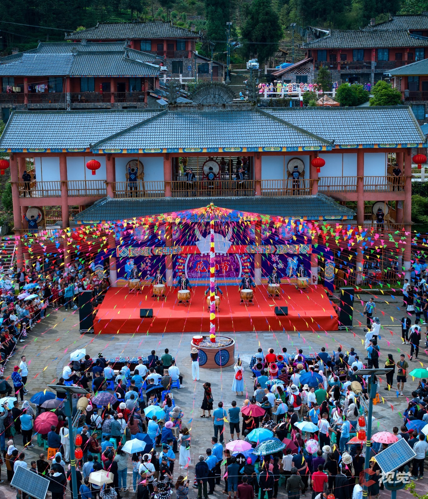 “阿妹站在寨门口,手捧一碗拦门酒,贵客你若进寨来,先喝一碗拦门酒……”在寨子门口,身穿节日盛装的苗族姑娘已等候在道路两旁,踏着悠扬的芦笙调,唱着动听的祝酒歌,为四方宾客献上苗家米酒。花杆是苗族谋求福祉的神,花竹是苗族繁荣兴旺的根,活动在传统的“祭花杆”仪式中拉开序幕。精彩的文艺表演陆续搬上舞台,苗族服饰走秀更是展现出民族艺术的独特风采。舞台周围,村民们身着苗族、彝族服饰,五彩斑斓、绚丽多姿。微风拂过,苗族女性帽檐上镶着的流苏银饰发出风铃般的清脆响声,动听悦耳。