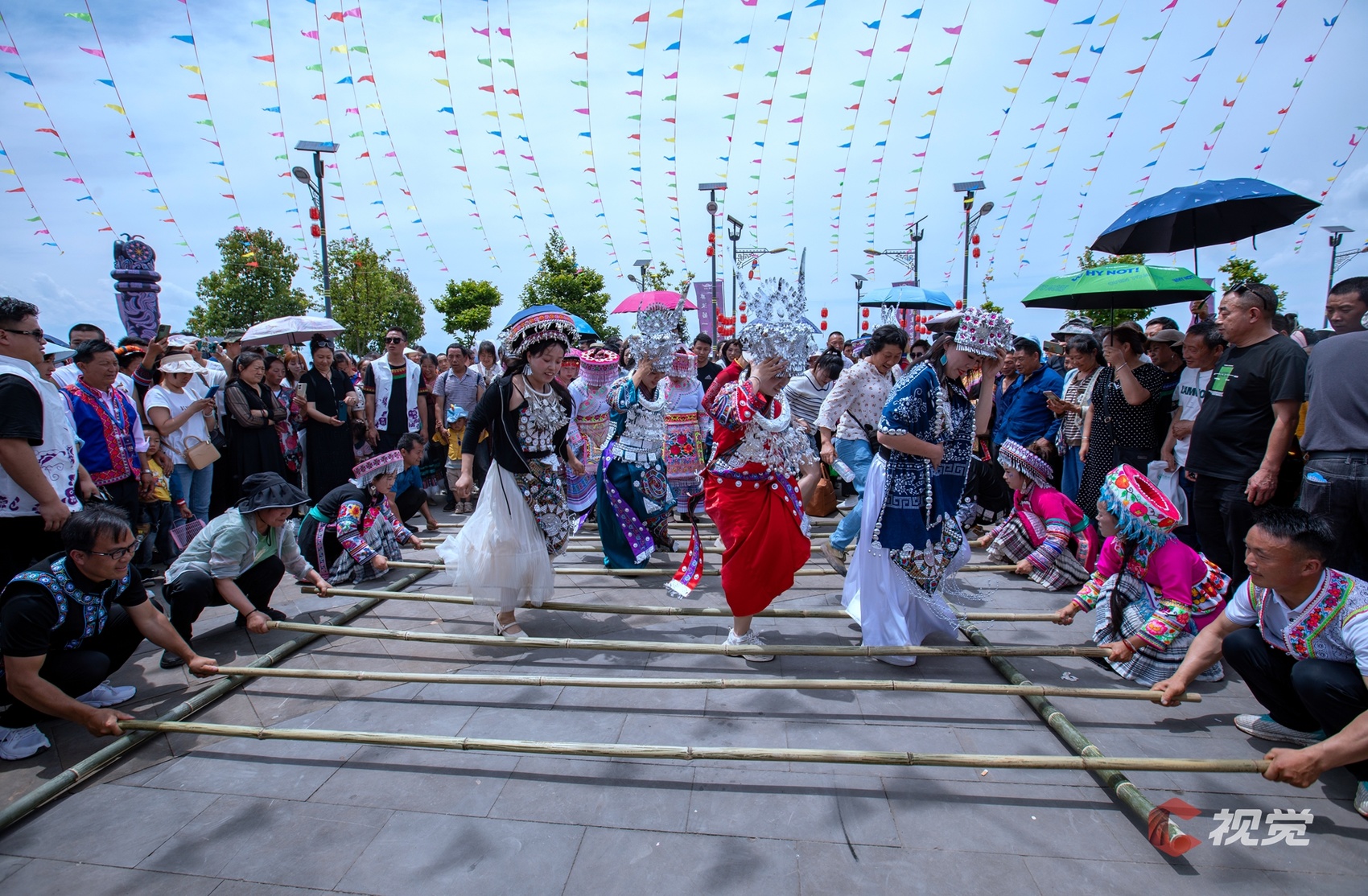 苗族姑娘与游客跳起欢快的“竹竿舞”。