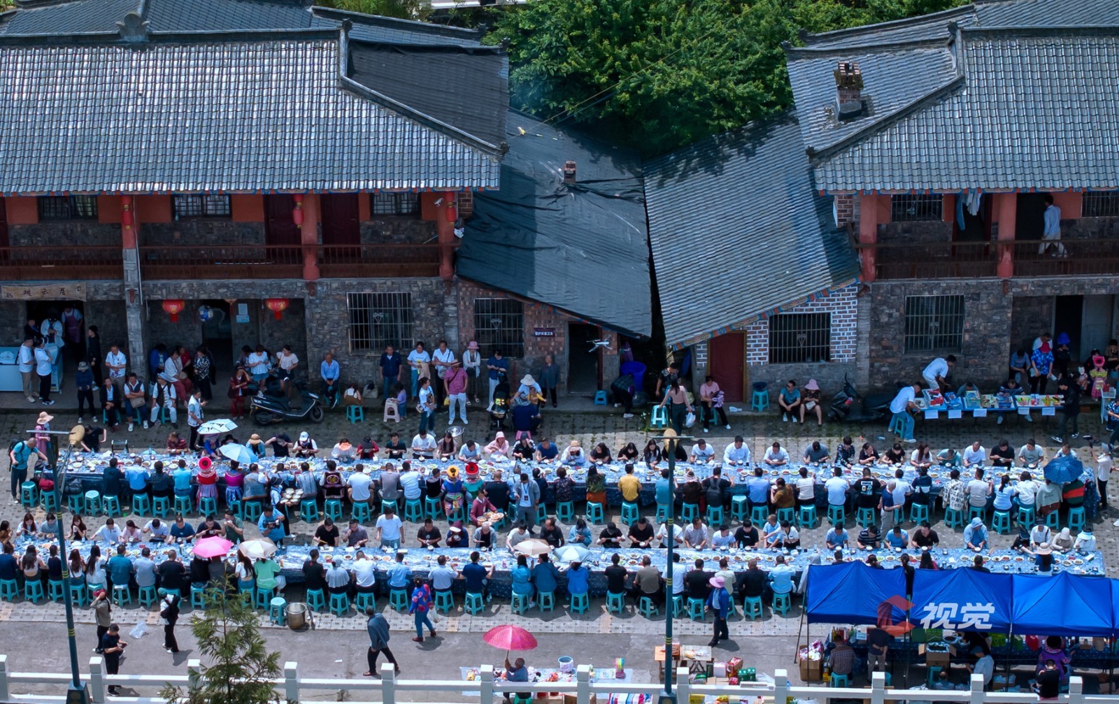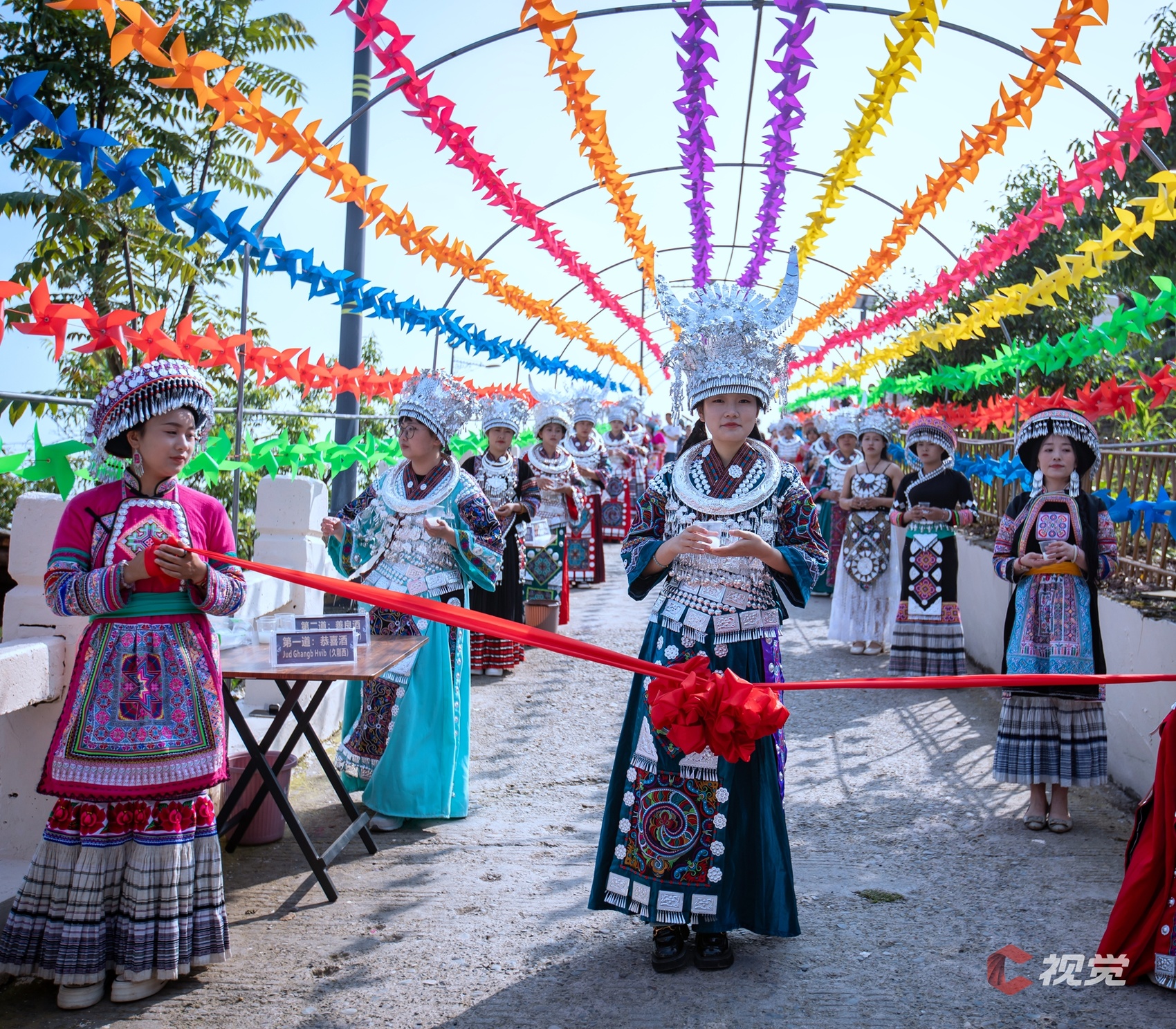 苗家特色“长桌宴”,大家欢聚一堂,举杯共庆美好。