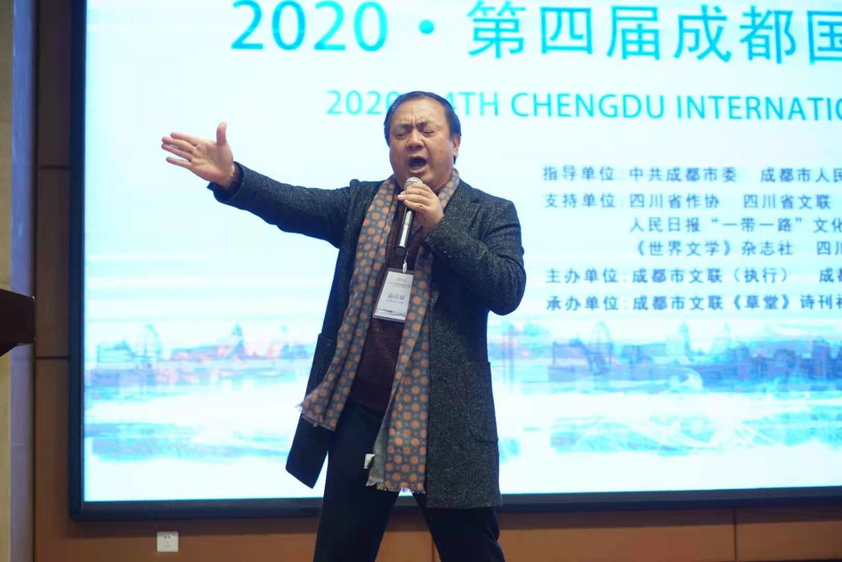 系着一条长围巾,诗人阿库乌雾走上舞台,顿了顿嗓子,声情并茂朗诵起自己的彝语诗歌《招支格阿尔之魂》。“回来吧,灵魂……”随着诗歌内容的递进,他的语调也越来越激扬。台下的观众纷纷停下手中的事情,向舞台望来。12月9日,2020·第四届成都国际诗歌周诗歌朗诵会在蓉城举行,来自全国各地的诗人在这里,放声吟诵,致敬经典。其中,西南民族大学民族语言文学研究院院长、诗人阿库乌雾的吟诵无疑让人印象深刻。他全程用一种类似说唱的方式吟诵彝族诗歌,略带舞台化的表现方式,感染力十足。那些铿锵有力彝语语调,像一声声惊雷,直击人心。尽管用彝语朗诵,让很多观众不知道诗中具体内容,但是却仍在抑扬顿挫的声调中,陶醉于彝语诗歌的韵律。阿库乌雾介绍,自己吟诵的诗歌讲述的是一种存在于彝人中的民间习俗,诗歌用一种呼喊的方式呼唤勇敢、美好的民族精神文化的回归。