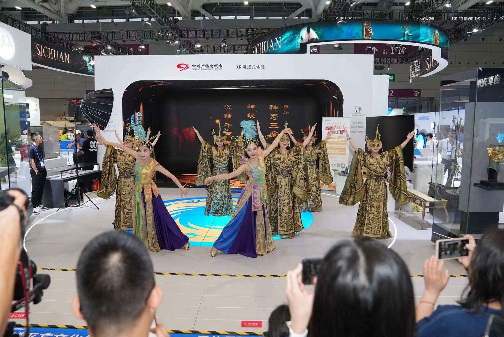 在四川日报报业集团展台,播放着“三星堆——沉睡数千年,一醒惊天下 ”平面裸眼3D视频和《蜀道翠云·两千年见树如面|XR沉浸式新闻情景短剧》,还有寻路东坡知识挑战赛等互动答题场景,融合川观数字记者等智媒技术,赋能巴蜀文化的活化利用。