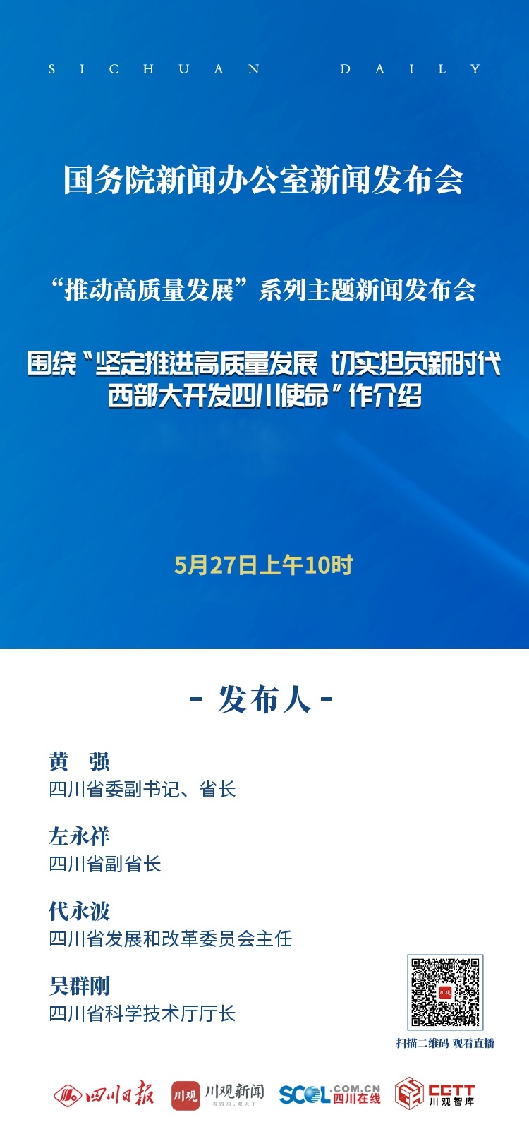 5月27日上午10时,国务院新闻办公室将在北京举行“推动高质量发展”系列主题新闻发布会四川专场。发布会上,四川省委副书记、省长黄强将围绕“坚定推进高质量发展 切实担负新时代西部大开发四川使命”介绍相关情况,并答记者问。