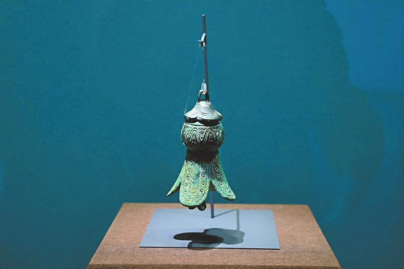 既有礼乐齐鸣,也有战场上的金音铿锵。展览中,一组铜钲、铜铎以及虎钮錞于颇为引人注目。钲,形似钟而狭长,有长柄可执,口向上,以物击之而鸣,主要用于军事方面。錞于,形如圆筒,上大下小,顶部有钮可悬挂,击之而鸣,同样多在战争中使用。巴蜀地区的錞于钮多做虎形,故有“虎钮錞于”之称。铎,形近于甬钟,俗称风铃,也在军队仪仗队中敲击使用。近几十年来,川渝地区出土了一批铜钲、铜铎以及虎钮錞于,它们成为《华阳国志·巴志》里“巴师勇锐,歌舞以凌殷人”记载的实物证据。广安市博物馆陈展部部长王浩辉介绍,如果说铜铃、石磬是古蜀先民与神灵沟通的见证,那么錞于、铜钲等乐器则折射出了巴人忠勇豪放的精神特质。