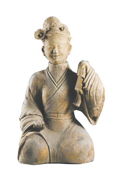 汉代的乐舞有多欢乐?击鼓俑席地而坐,头戴高冠,做出拍打之势;抚耳歌唱俑双膝着地跪坐在腿上,头戴冠帽,双手抚膝、抚耳,表现出听琴、歌唱的姿态……最有名的当然是汉代说唱俑。上世纪80年代出土于成都天回镇、现存于国家博物馆的东汉击鼓说唱陶俑,因其神态诙谐,动作夸张,活现一俳优正在说唱的形象,被誉为“天下第一俑”,此次展出的3件说唱俑,无不动作夸张、表情恢谐幽默,生动反映出时人乐天开朗的精神状态。