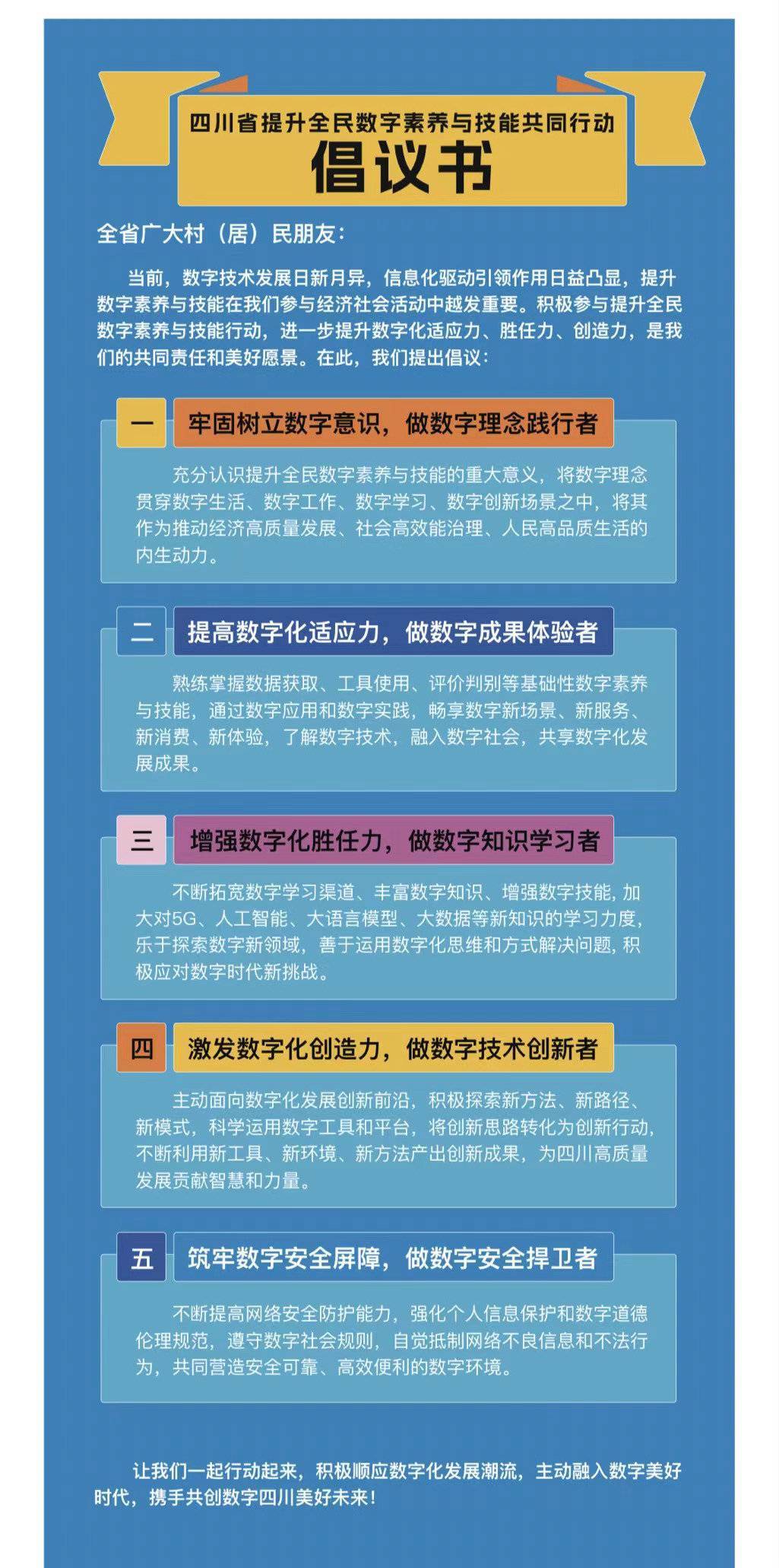 《四川省提升全民数字素养与技能共同行动倡议书》倡议,全省广大村(居)民,牢固树立数字意识,做数字理念践行者;提高数字化适应力,做数字成果体验者;增强数字化胜任力,做数字知识学习者;激发数字化创造力,做数字技术创新者;筑牢数字安全屏障,做数字安全捍卫者。