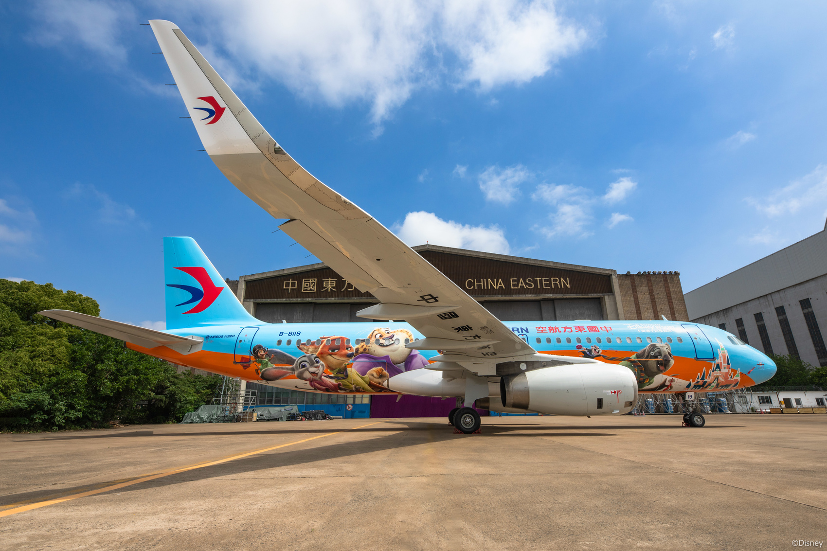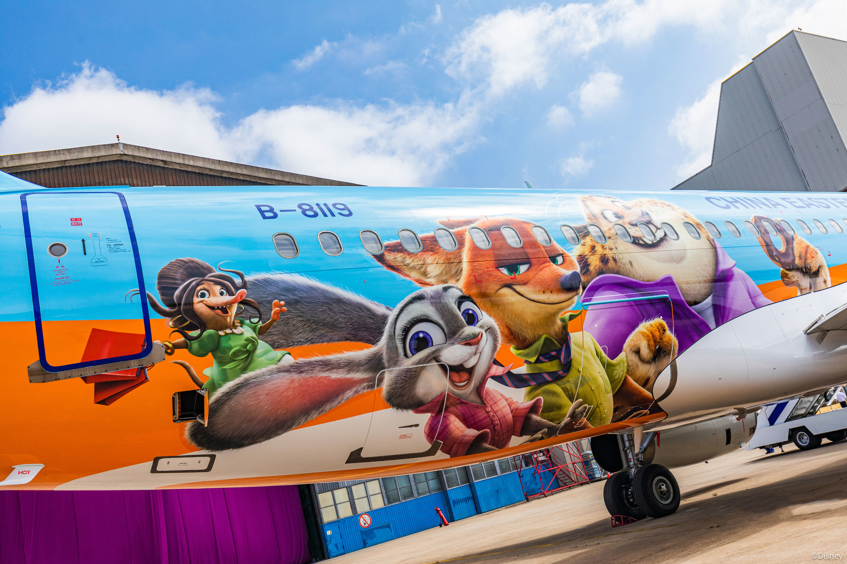 作为迪士尼经典故事讲述的又一范例,全新主题飞机承载着《疯狂动物城》动画电影的精彩故事飞向广袤的蓝天。飞机的外形彩绘栩栩如生地还原了电影中兔子朱迪、狐狸尼克等众多备受观众喜爱的动物角色。值得一提的是,该架首航飞机创新地使用了涂装贴花技术,也是中国东方航空首架呈现3D立体迪士尼角色图案的主题彩绘飞机。