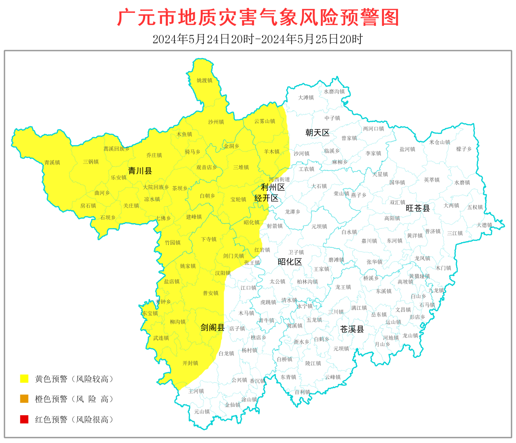未来24小时,广元市地质灾害气象风险黄色预警范围。广元市地质灾害指挥部办公室供图