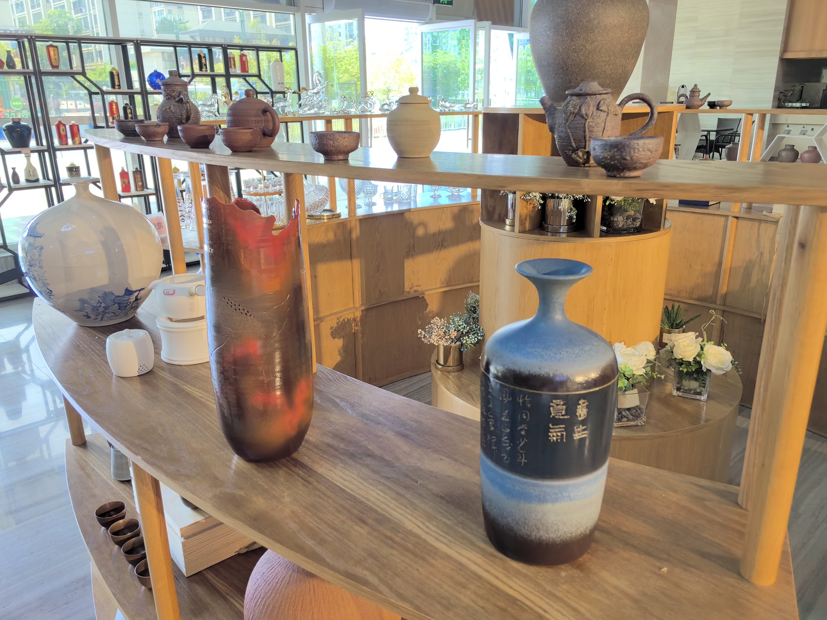 剧场内节目精彩纷呈之时,莲峰大剧院外围的回廊上,隆昌市非遗推介展也已悄然开启。夏布绣、夏布扇、夏布画等各类工艺品琳琅满目,各种隆昌土陶制品造型典雅、色彩各异、古朴大方。