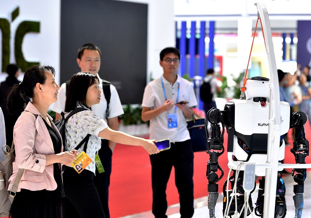 5月24日,以“释放数据要素价值,发展新质生产力”为主题的第七届数字中国建设峰会在福建福州开幕。 图为当天现场体验区,观众在观看“移动爱家机器人”。新华社记者 魏培全 摄