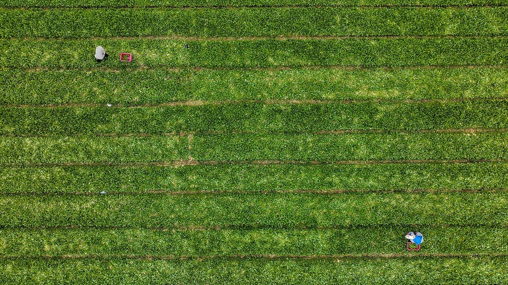 5月以来,宁夏银川市贺兰县冷凉蔬菜迎来采收佳期,工作人员在田间忙碌。贺兰县共有15个冷凉蔬菜生产基地,总播种面积超过10万亩,这里是宁夏菜心的主要产区之一。图为5月24日,工作人员在宁夏贺兰县立岗镇银星村一冷凉蔬菜种植基地采摘菜心(无人机照片)。新华社记者 冯开华 摄