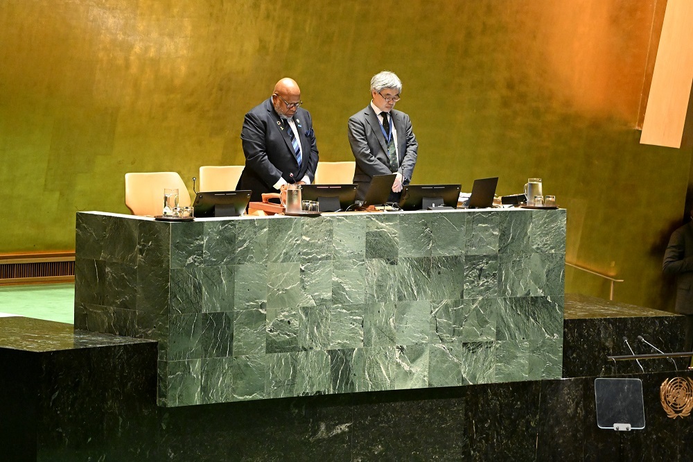 5月23日,在纽约联合国总部,第78届联大主席丹尼斯·弗朗西斯(左)主持默哀仪式。默哀仪式在联大关于和平文化主题的全体会议开始前举行,以纪念19日在伊朗西北部因直升机坠毁而不幸遇难的伊朗总统莱希。新华社发(联合国供图/埃文·施耐德 摄)