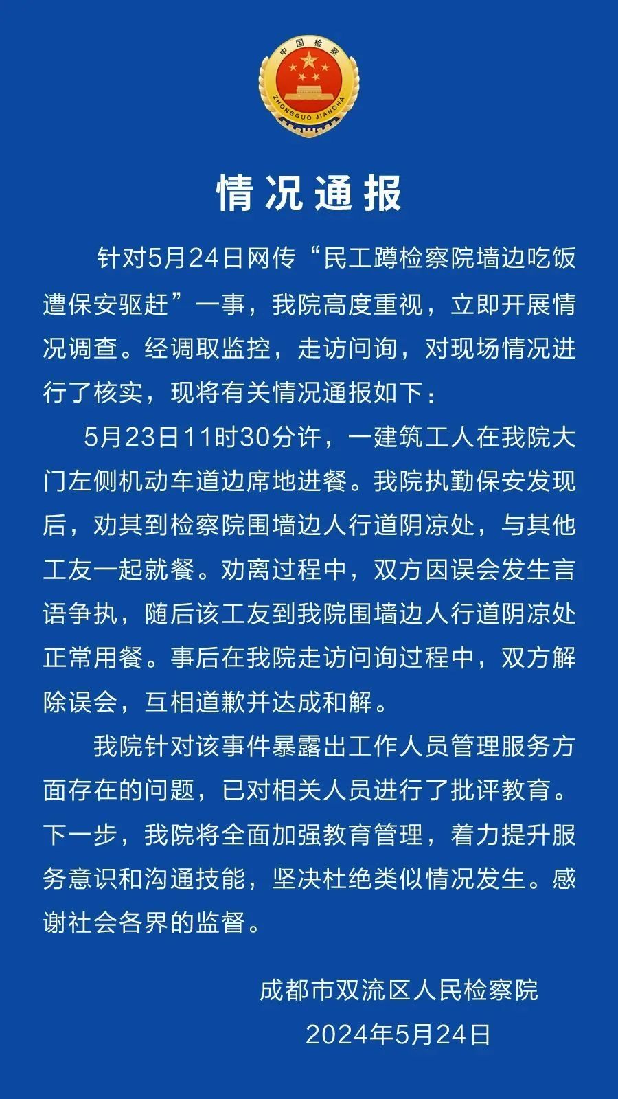针对5月24日网传“民工蹲检察院墙边吃饭遭保安驱赶”一事,我院高度重视,立即开展情况调查。经调取监控,走访问询,对现场情况进行了核实,现将有关情况通报如下: