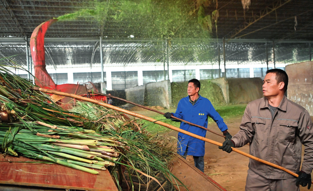 工作人员在广西来宾市兴宾区大湾镇双诚牧业有限公司粉碎甘蔗尾叶,准备制作牛饲料(2023年12月13日摄)周华摄 / 本刊