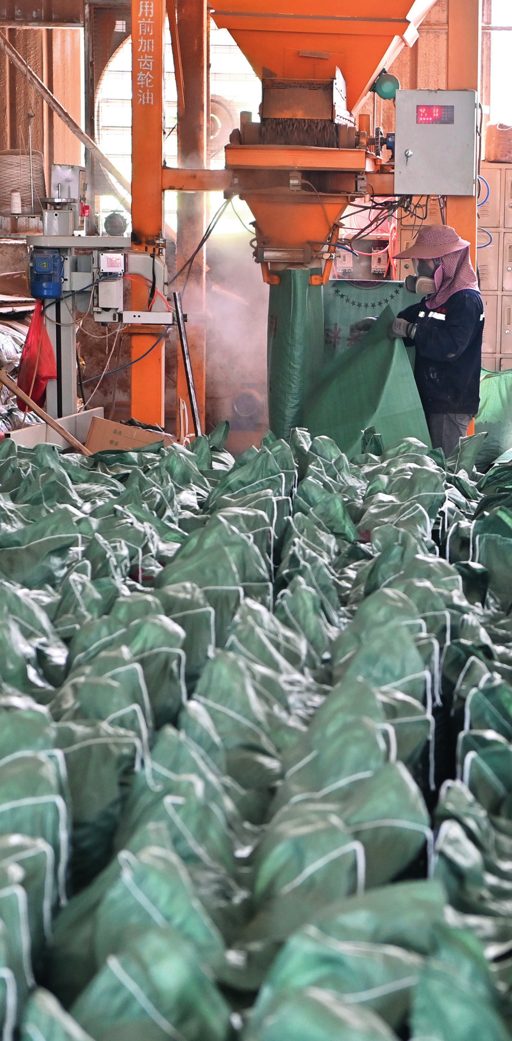 工作人员在广西来宾小平阳镇一家饲料厂将甘蔗叶为主要原料的饲料装袋(2023年12月12日摄)周华摄 / 本刊