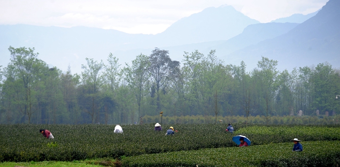 洪雅茶园,茶农正在采摘新鲜绿茶