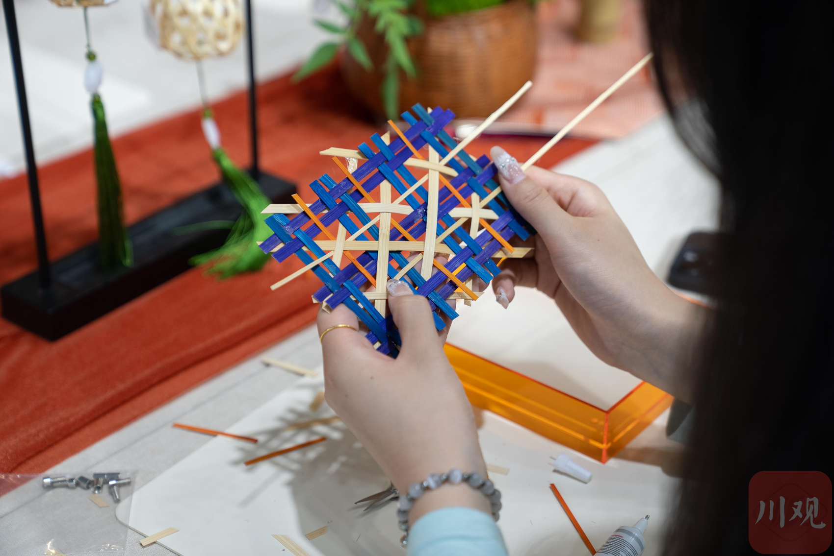 “青神竹编的体验活动很受欢迎,今天主要教大家用基础的经纬编织法,体验竹编制作的雅韵,大家都很乐在其中。”展会工作人员、笙笛艺术文创设计师董慧告诉记者,作为国家级非遗的青神竹编,历史悠久、技艺精湛,承载着意蕴丰厚的竹文化内涵,在活动设计时,特别选择了青神竹编体验作为一大主题。