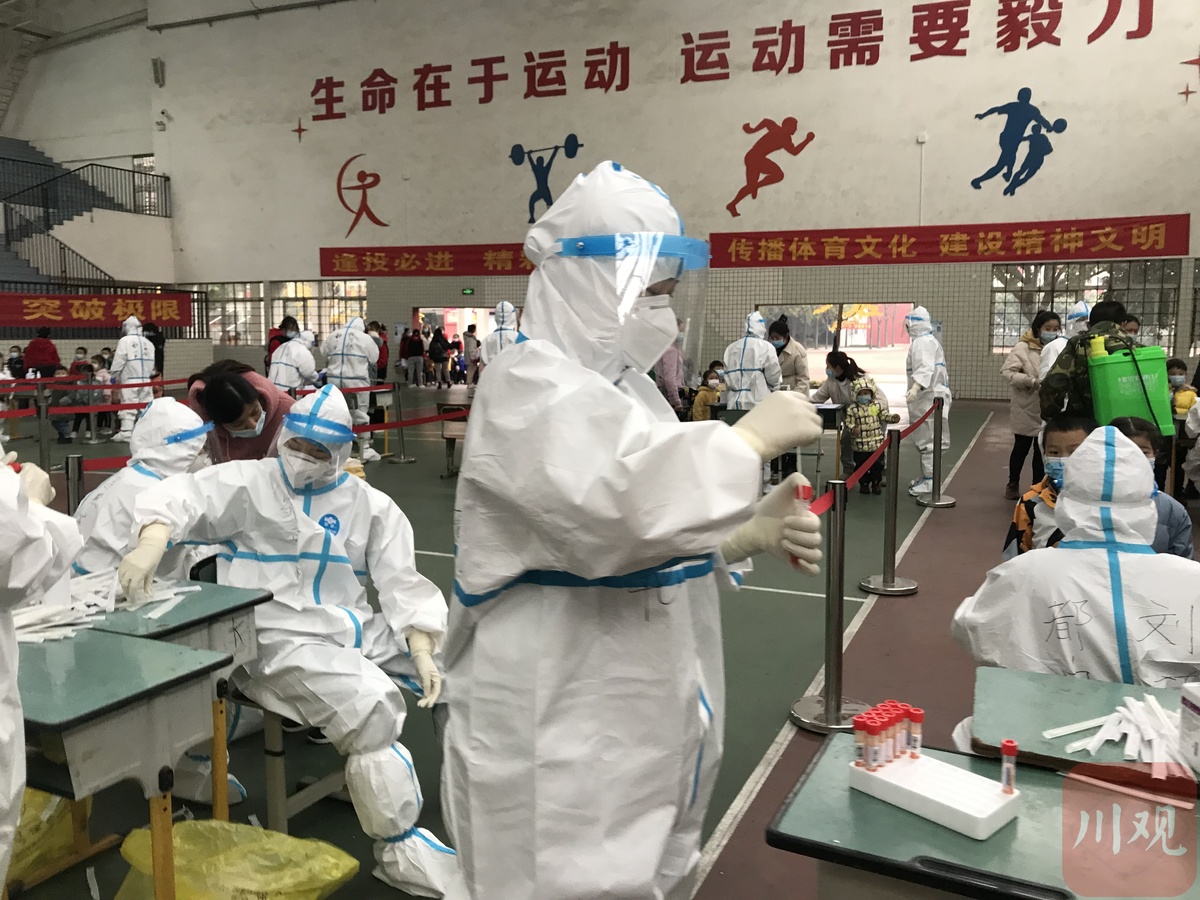 当天,都江堰第二医院和都江堰中医院医务人员身穿防护服分成6组,对郫都四中2342名师生,以及来自犀浦街道的梓潼幼儿园、成都市郫都区克莱斯特幼儿园、成都市郫都区哈佛美语幼儿园共计2249名师生进行了快速、规范的核酸检测。