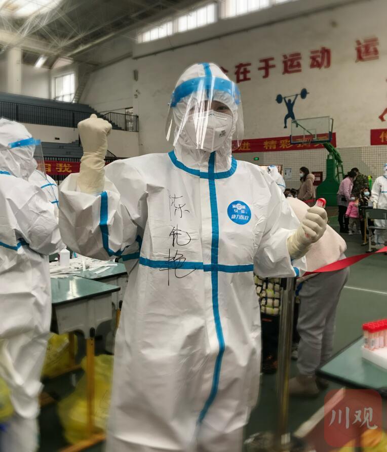 陈先艳告诉川观新闻记者,这是她第二次主动请缨参与防疫。今年年初,面对突如其来的疫情,刚入职一年的陈先艳也是通过主动报名,最终在都江堰市中医院的隔离病房进行相关防疫工作。当记者还想问询更多,陈先艳摆了摆手,“下次吧!现在更重要的还是把孩子们的核酸检测做完。”
