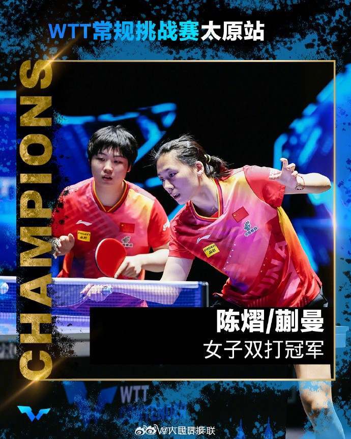 稍早前的女双决赛中,陈熠/蒯曼3比1战胜王艺迪/陈幸同,夺得冠军。祝贺!