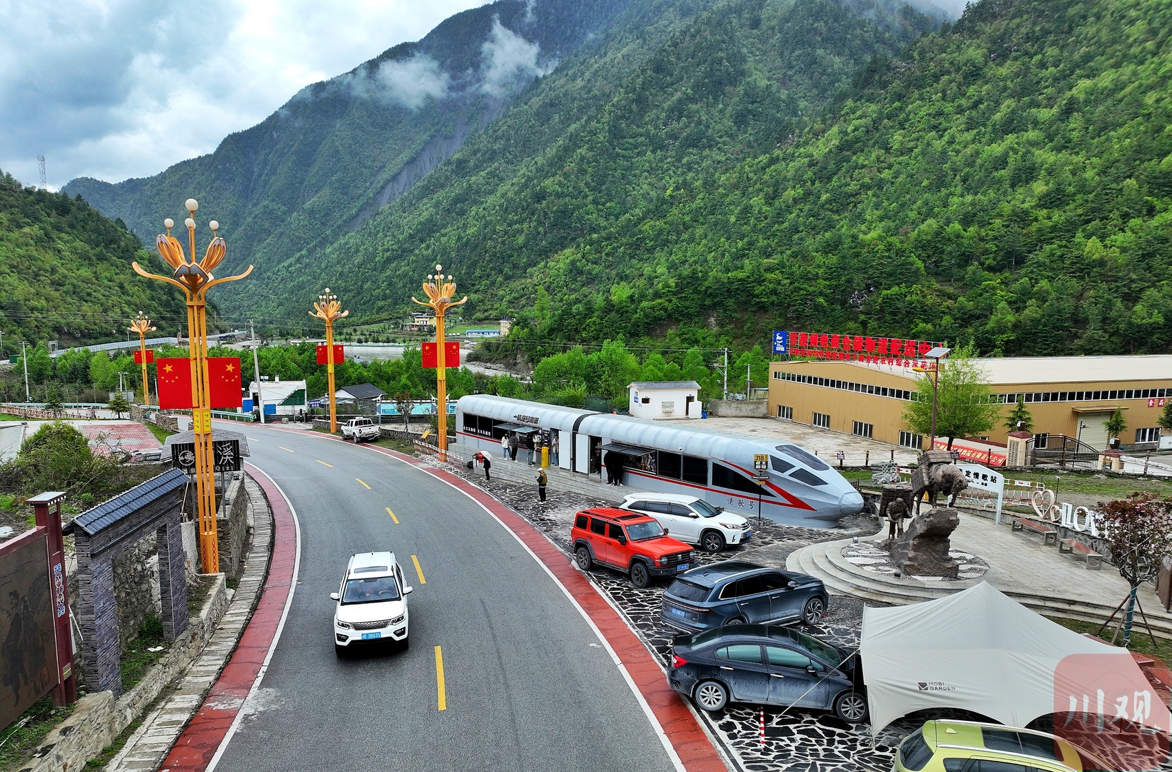 康定市王母村是乡村振兴先行示范村,沿街民居建筑改造、绿地改造让王母村面貌一新。图为村里打造的“康定情歌站”情歌号咖啡店,自驾游者都会在这停留打卡