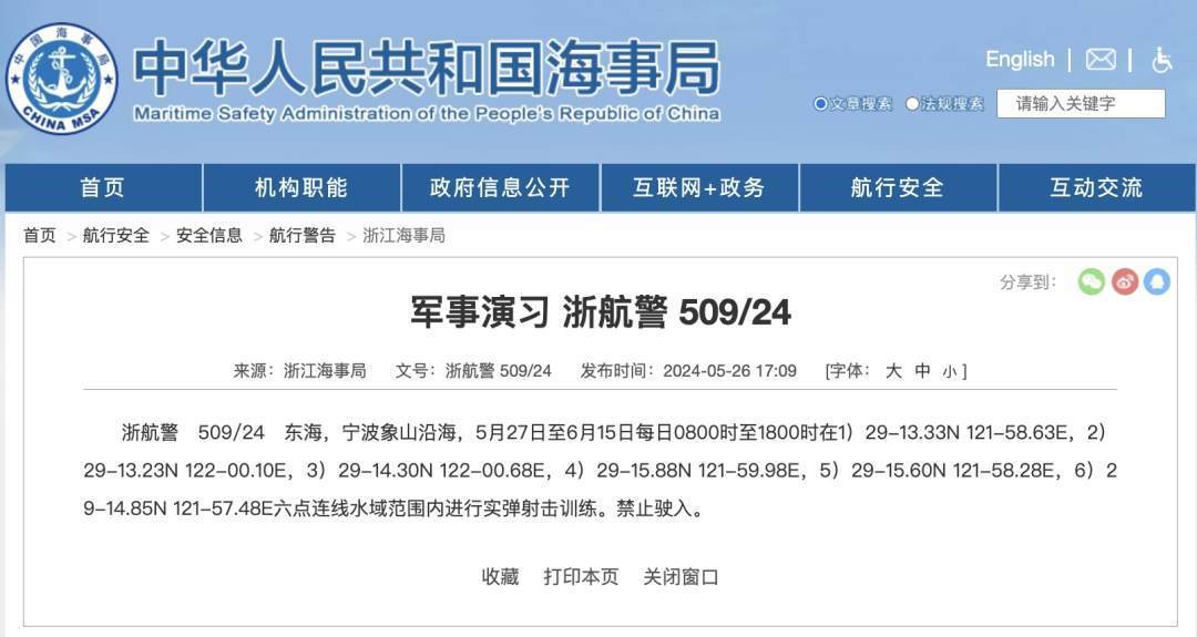 浙江海事局发布航行警告,5月27日至6月15日每日8时至18时,东海宁波象山沿海进行实弹射击训练,禁止驶入。