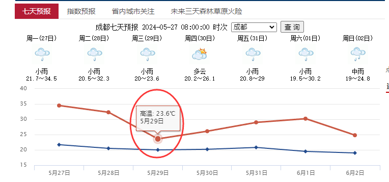 成都明日开始将降温。图据四川省公共气象服务网