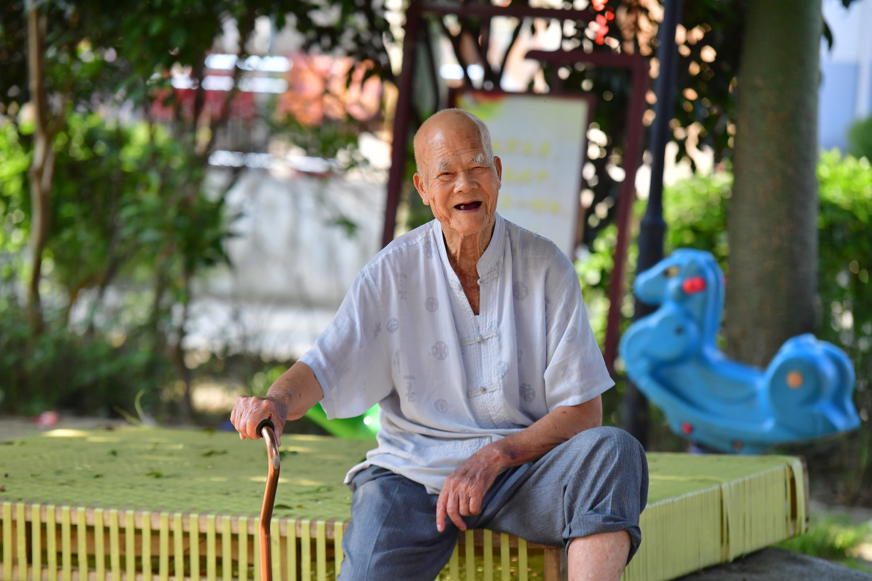 93岁的韦绍堂老人在小广场上休闲(5月23日摄)。