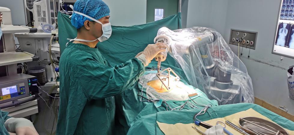 患者安静地躺在手术台上,各项术前准备工作均已就绪,在手术医生的实时监控下,机器人“手臂”缓缓移动,按照术前设计好的路径,一次性在患者的胸椎上穿刺成功……这不是科幻片场景,而是绵阳市骨科医院手术室真实上演的现实操作。