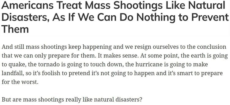 有美媒称,对于一起又一起枪击事件,如今的美国只是进行数字的统计,却无力采取行动改变现状,似乎在美国人眼里,枪支暴力已经成为像洪水、飓风、野火一样的“天灾”,而不是可以预防的人祸。